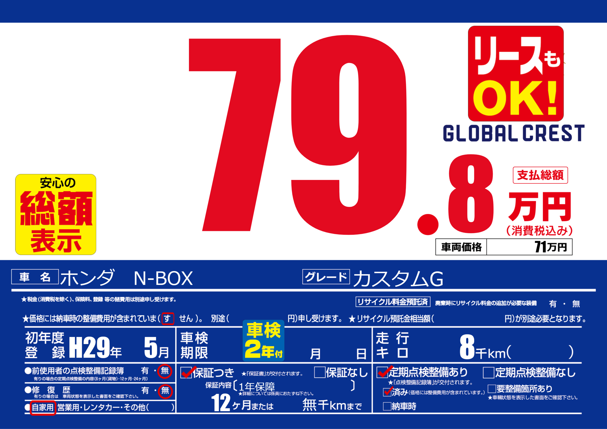 | 走行キロ | 0.8万km | 初年度登録 | H29年5月 |