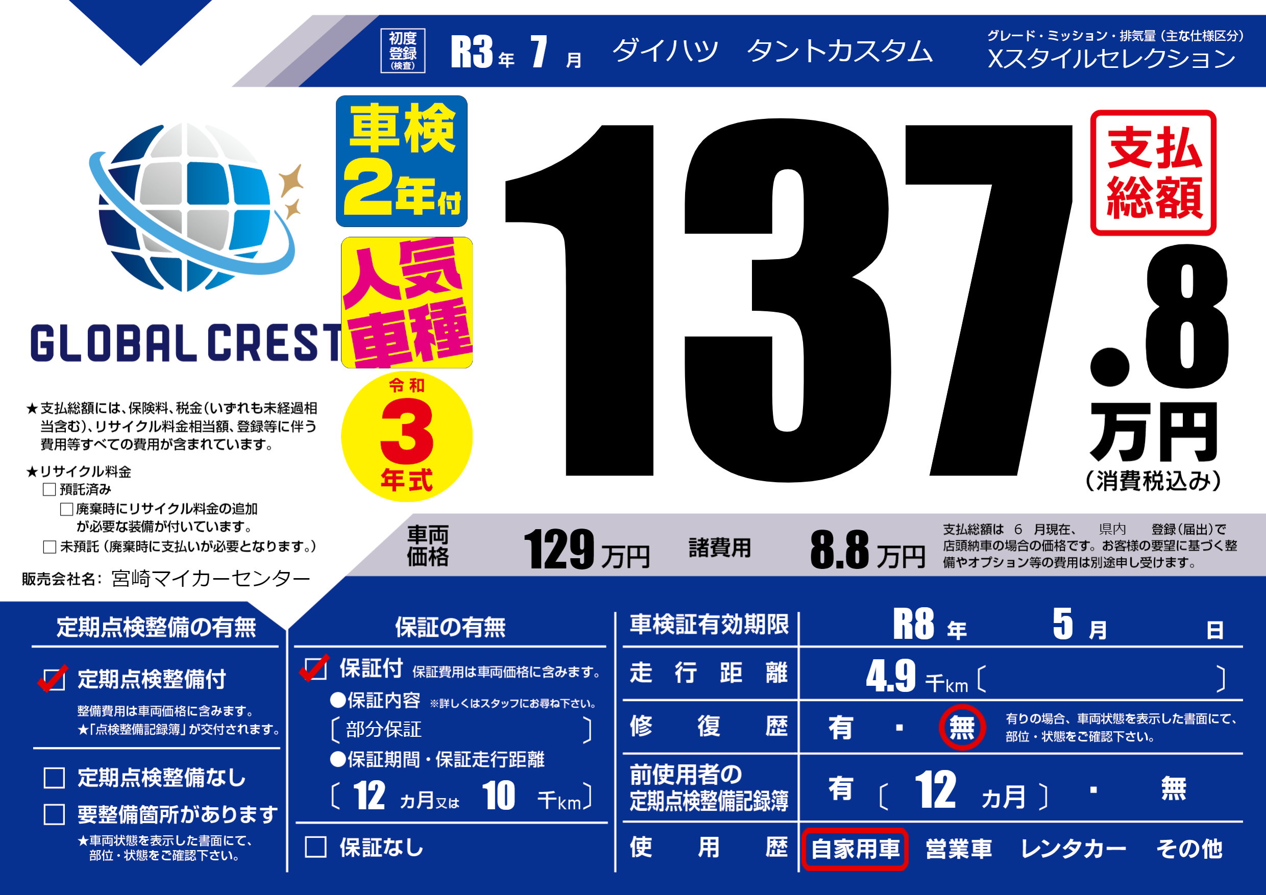 | 車検制限 | R8年 5月 - 日 | ||