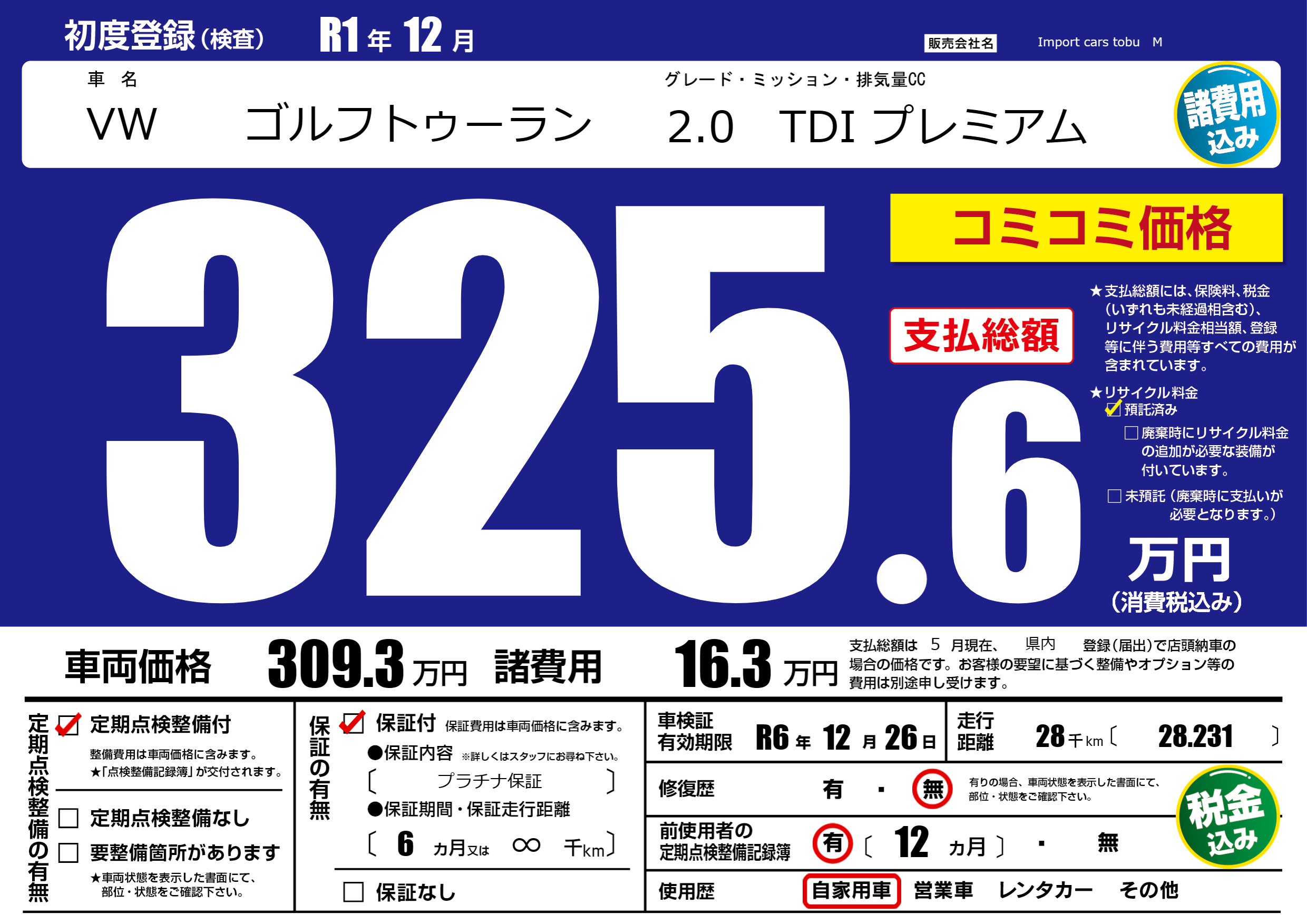 | 車名 | VW ゴルフトゥーラン | グレード ミッション 排気量 |