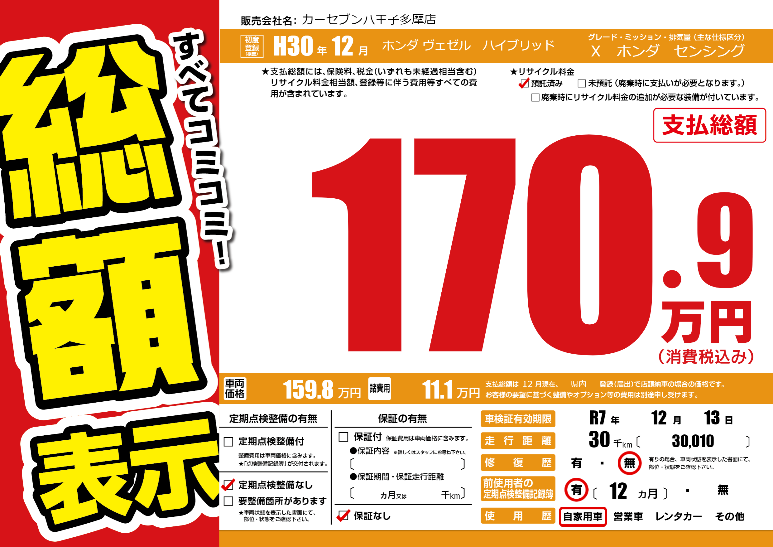 | 車名 | ホンダ ヴェゼル ハイブリッド | グレード ミッション 排気量 |