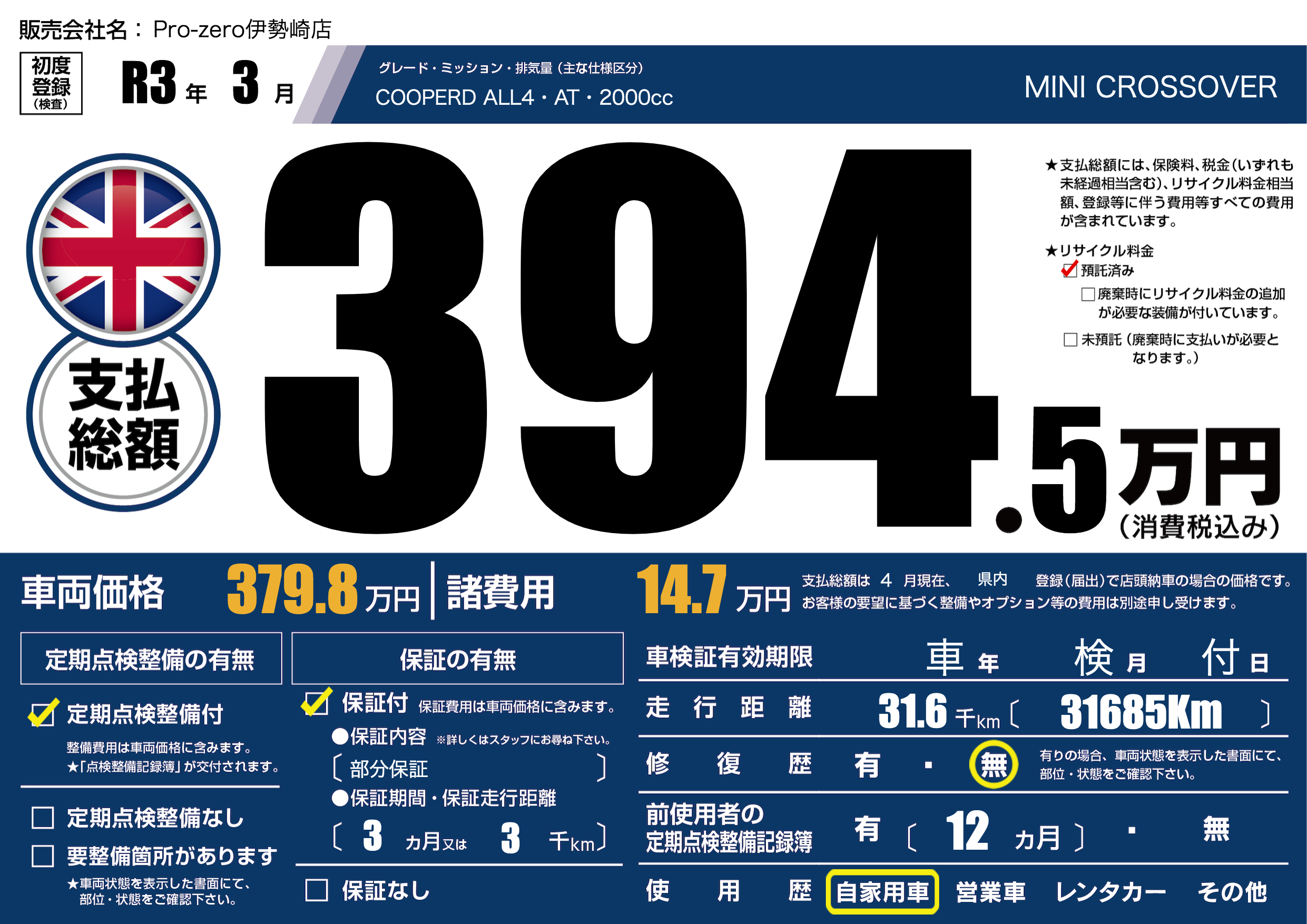 | 走行キロ | 3.1万km | 初年度登録 | R3年3月 |