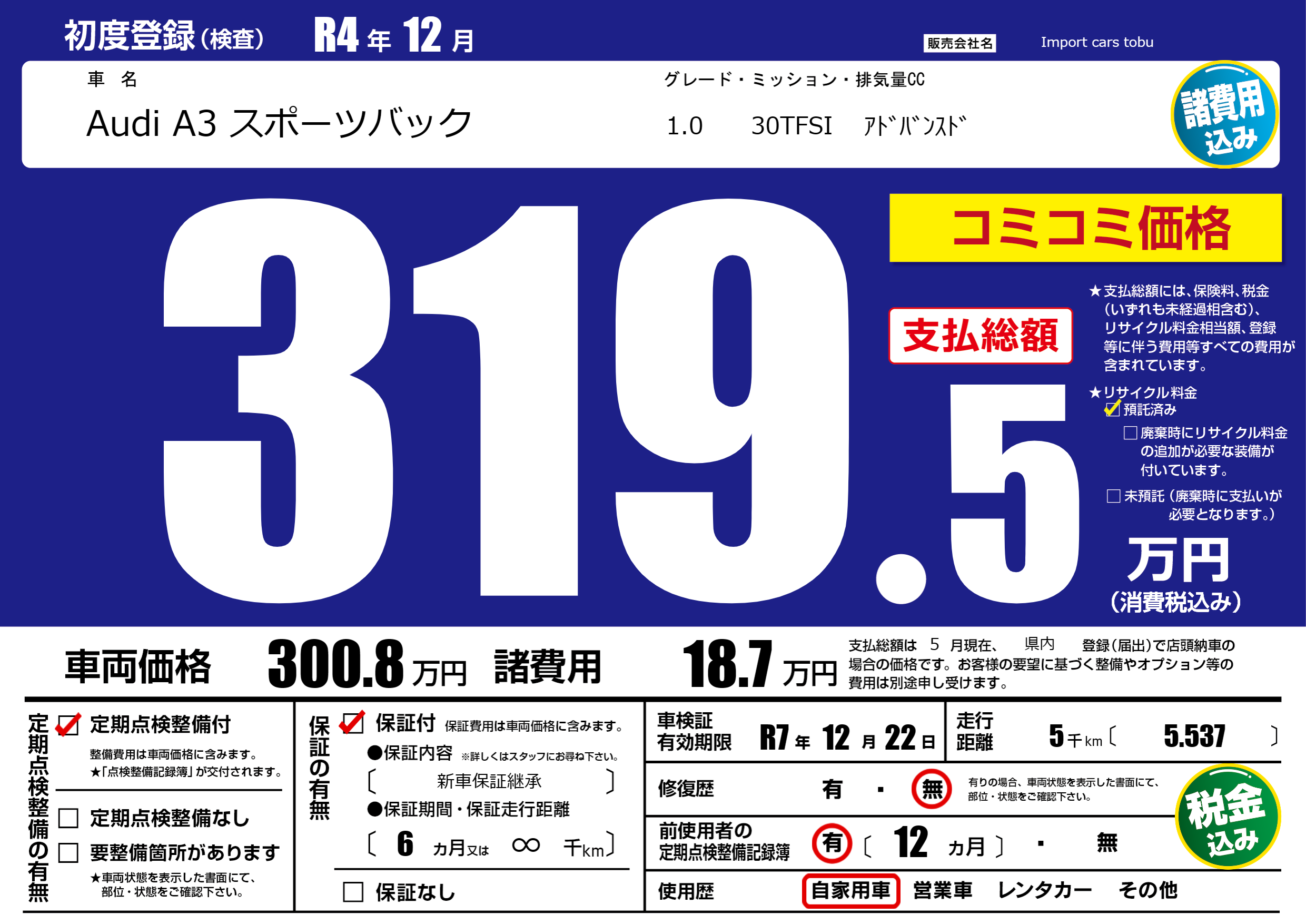 | 車名 | Audi A3 スポーツバック | グレード ミッション 排気量 |