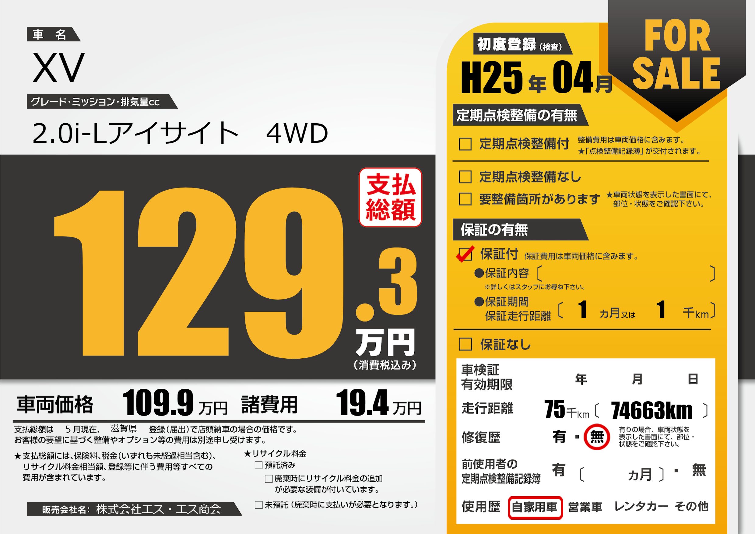 | 走行キロ | 7.5万km | 初年度登録 | H25年04月 |