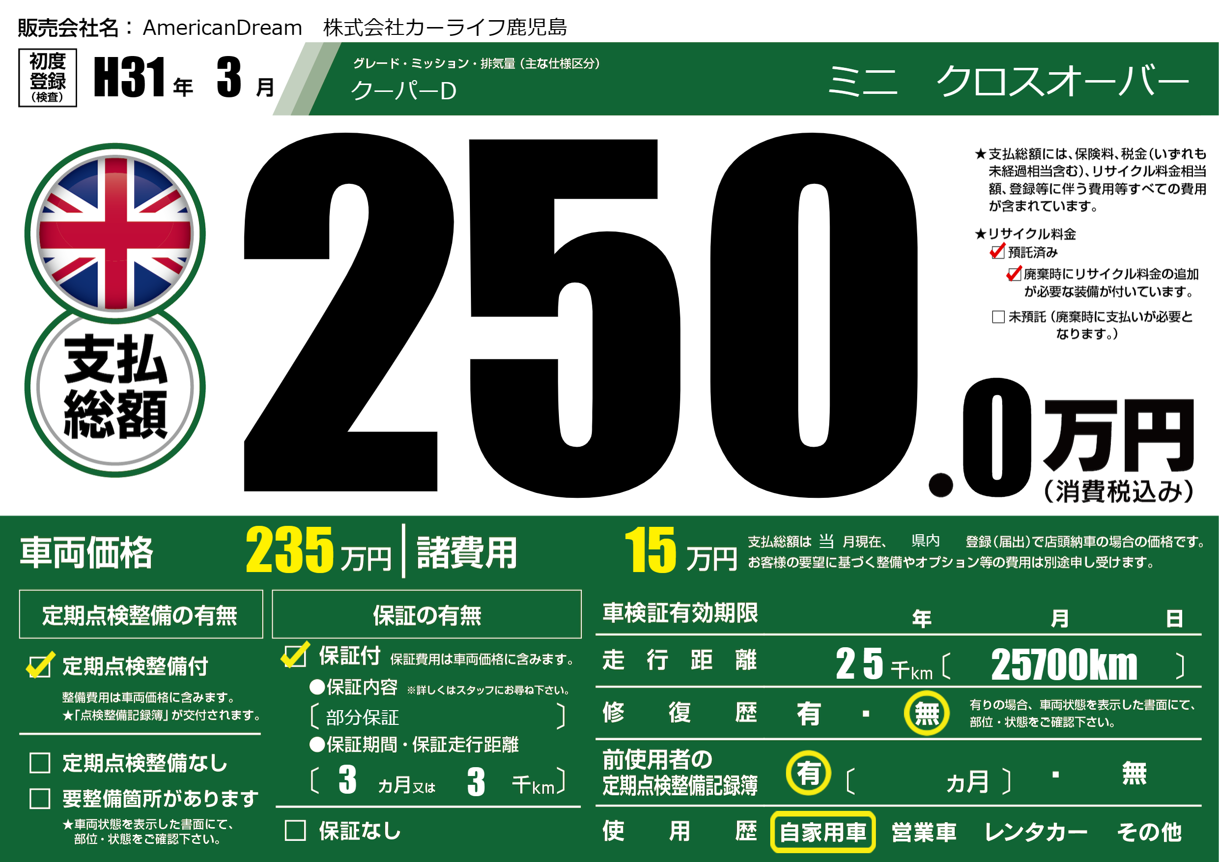 | 車名 | ミニ クロスオーバー | グレード ミッション 排気量 |