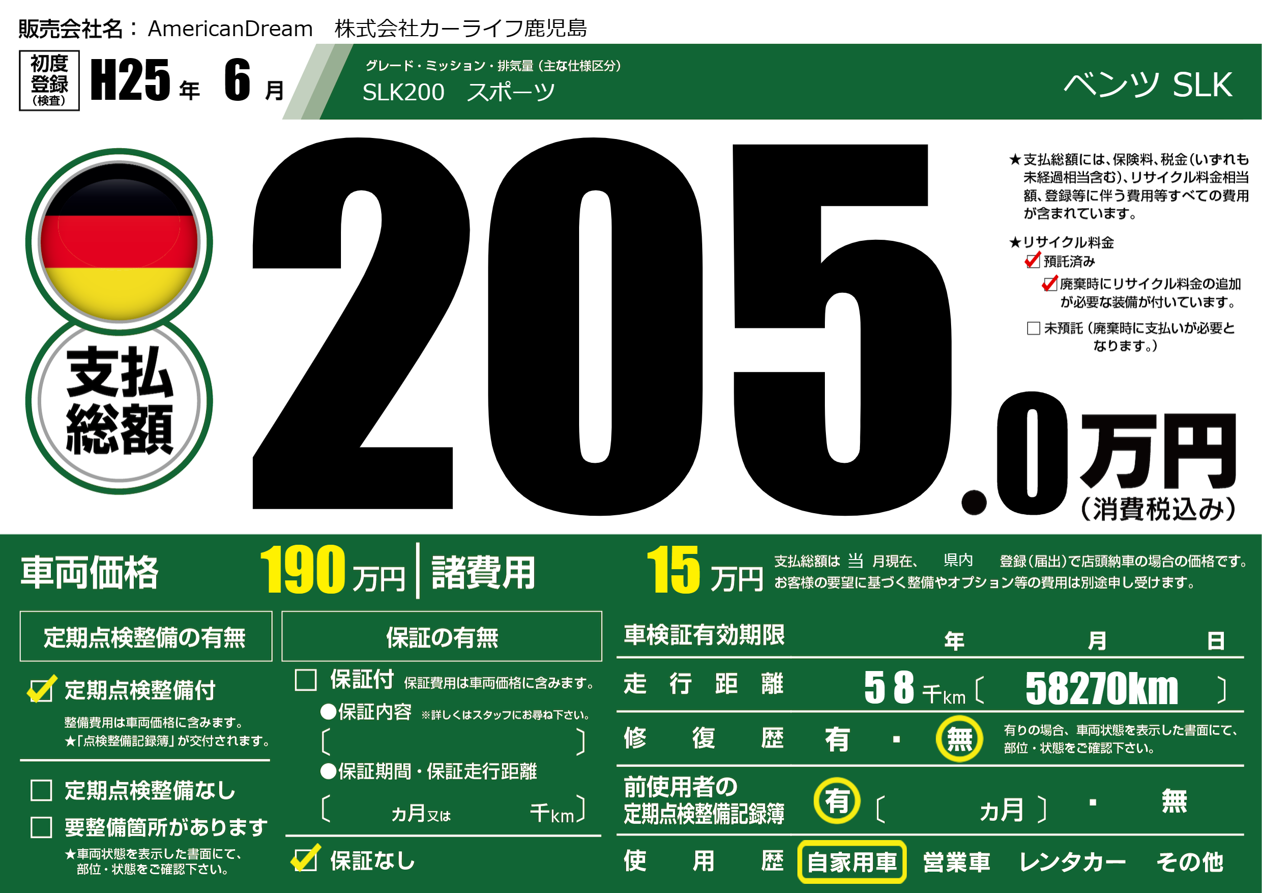 | 車名 | ベンツ SLK | グレード ミッション 排気量 |