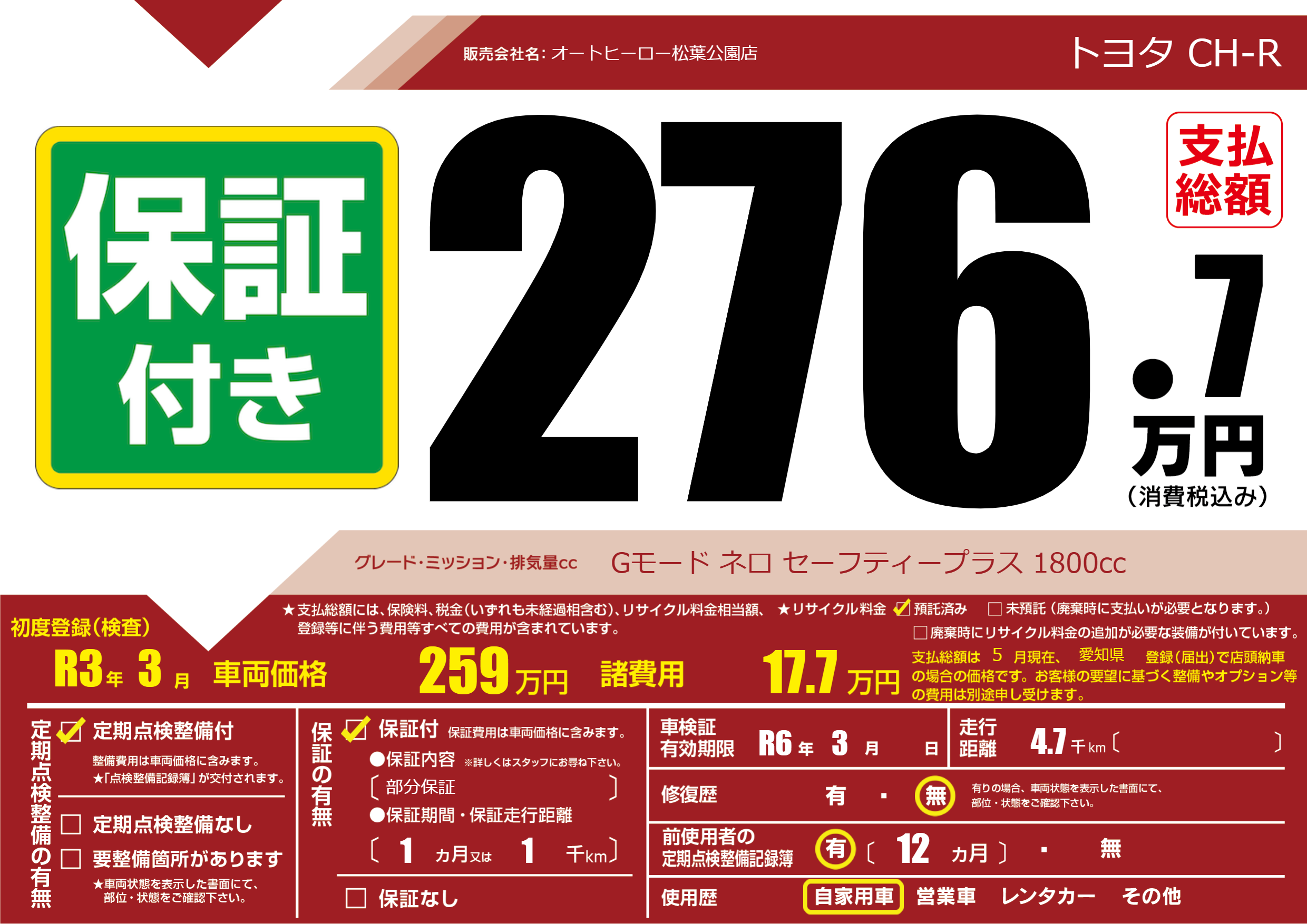 | 車名 | トヨタ CH-R | グレード ミッション 排気量 |