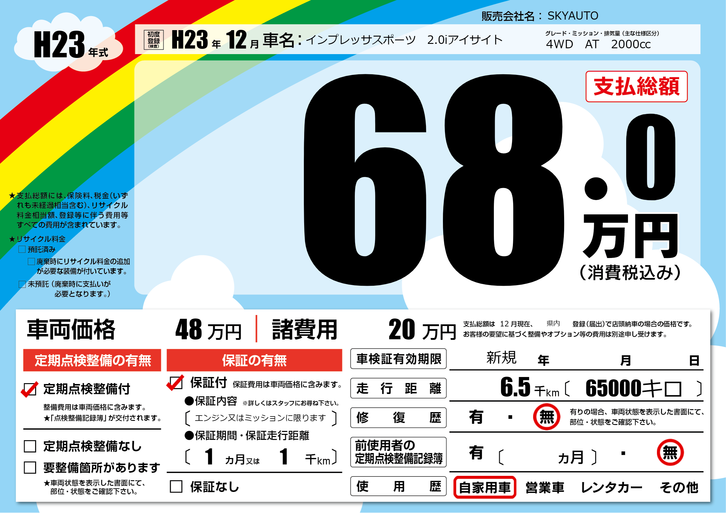 | 走行キロ | 0.6万km | 初年度登録 | H23年12月 |