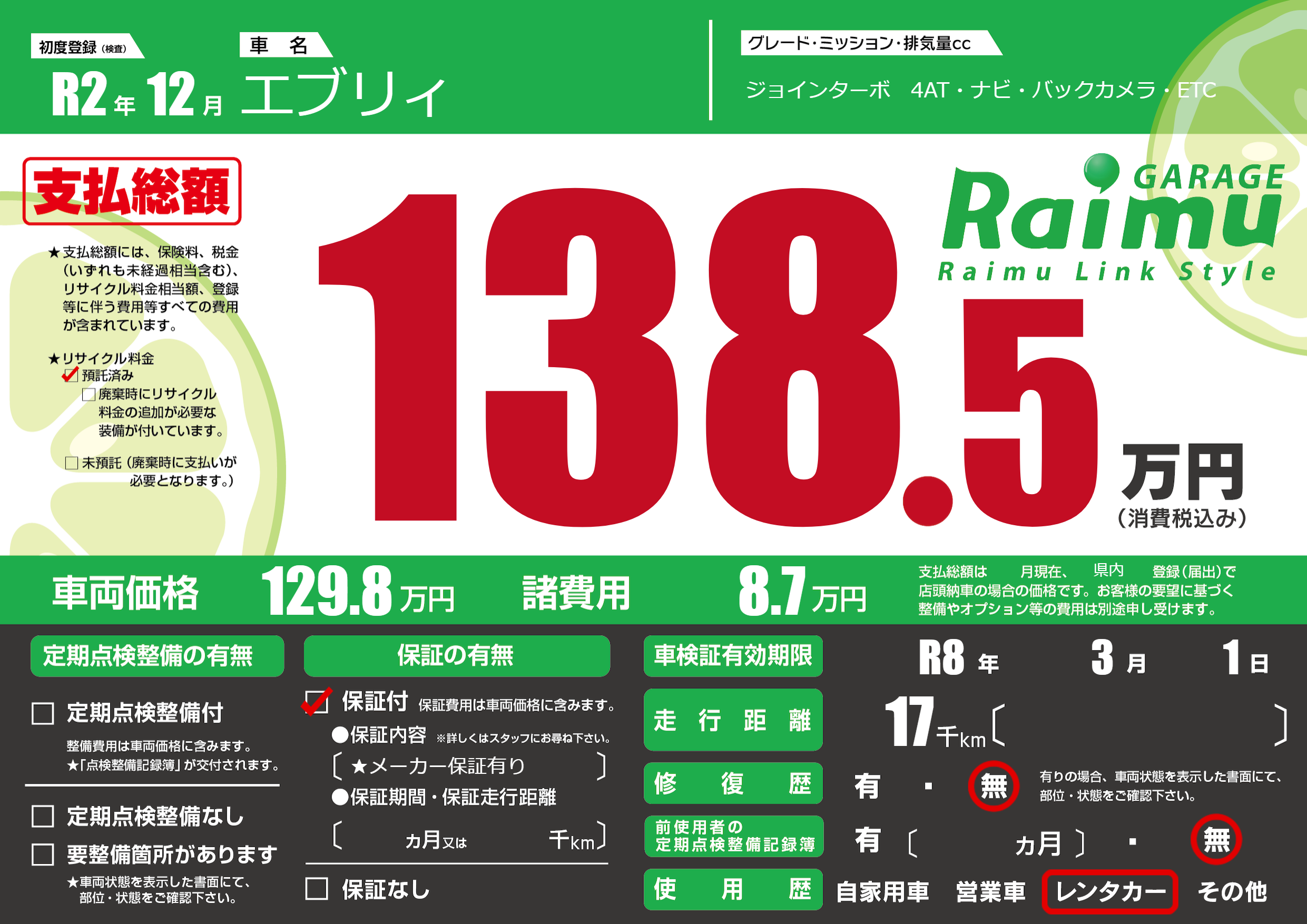 | 車名 | エブリィ | グレード ミッション 排気量 |