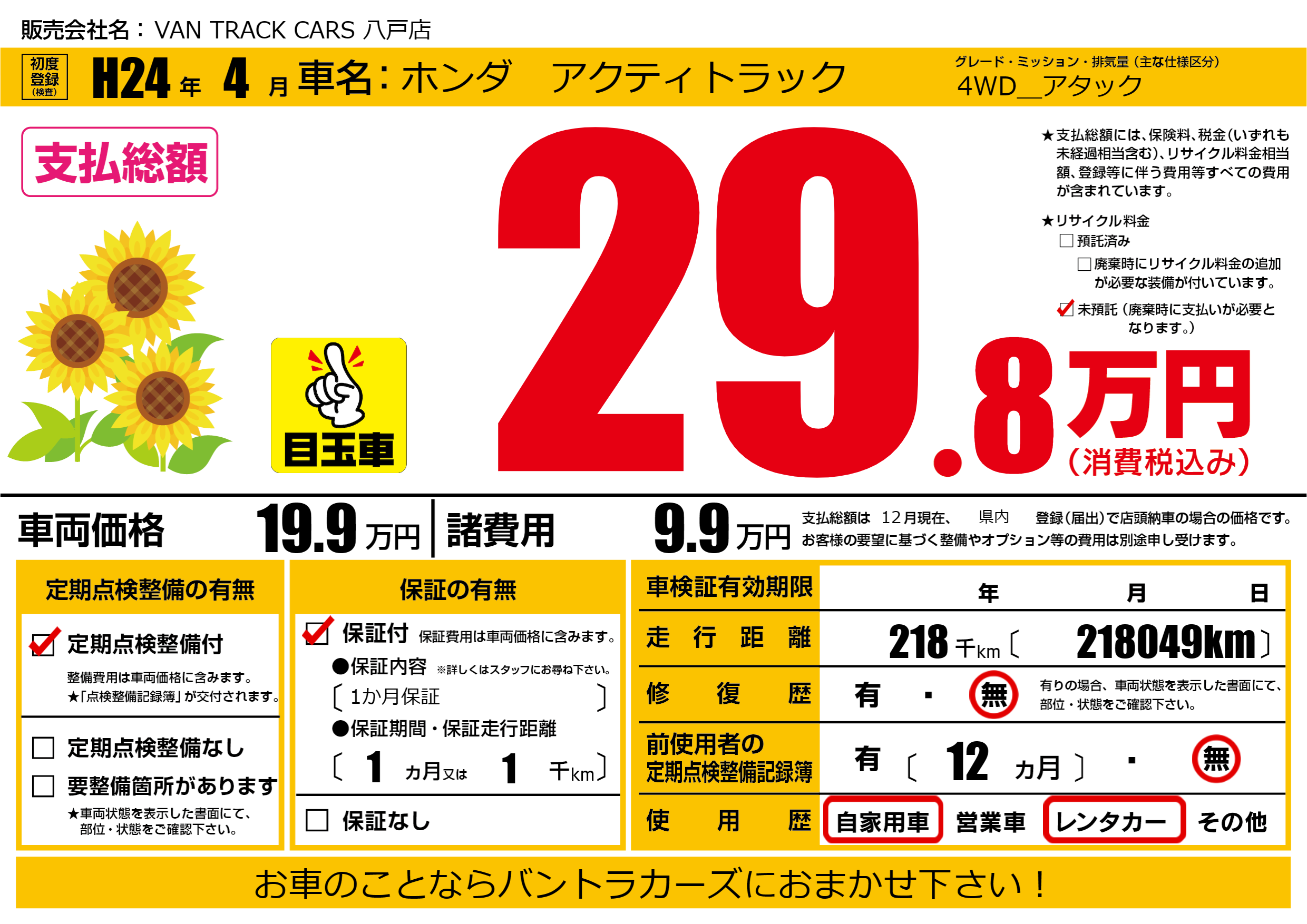 | 走行キロ | 21.8万km | 初年度登録 | H24年4月 |