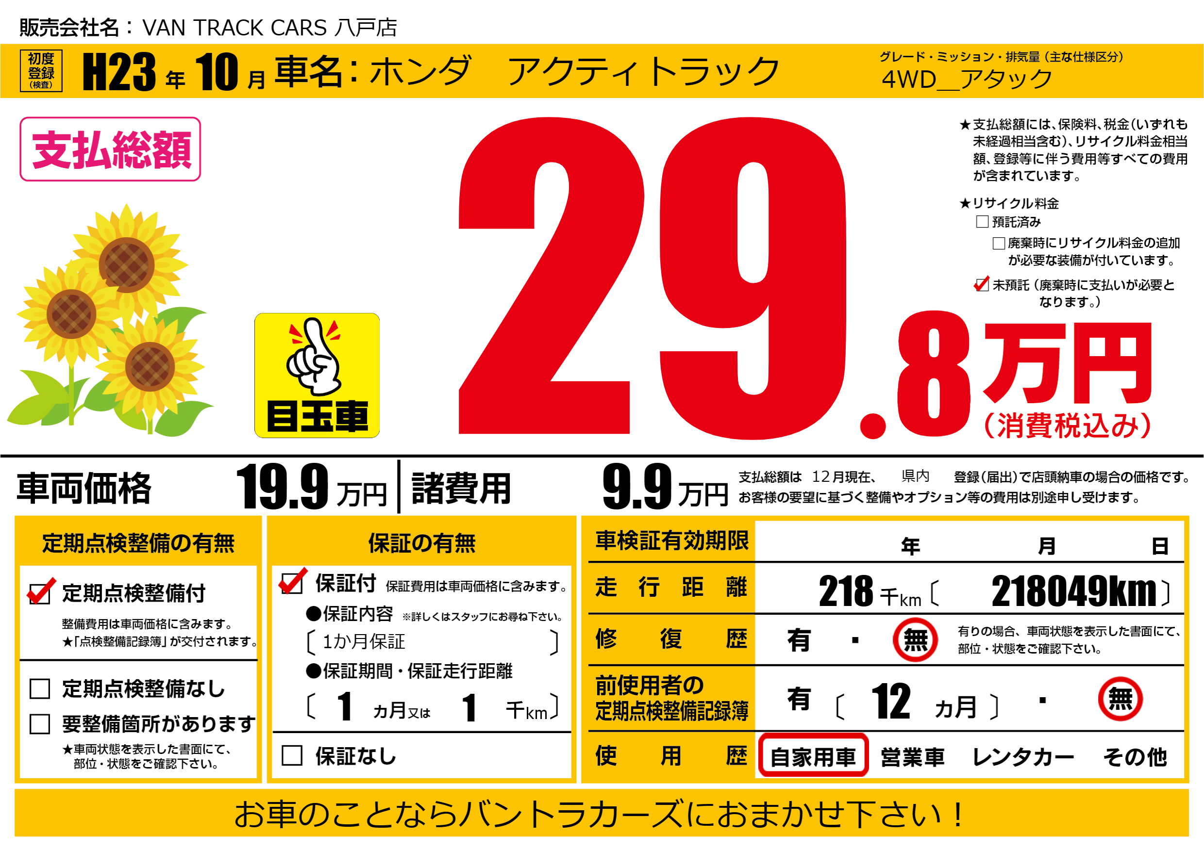| 走行キロ | 21.8万km | 初年度登録 | H23年10月 |