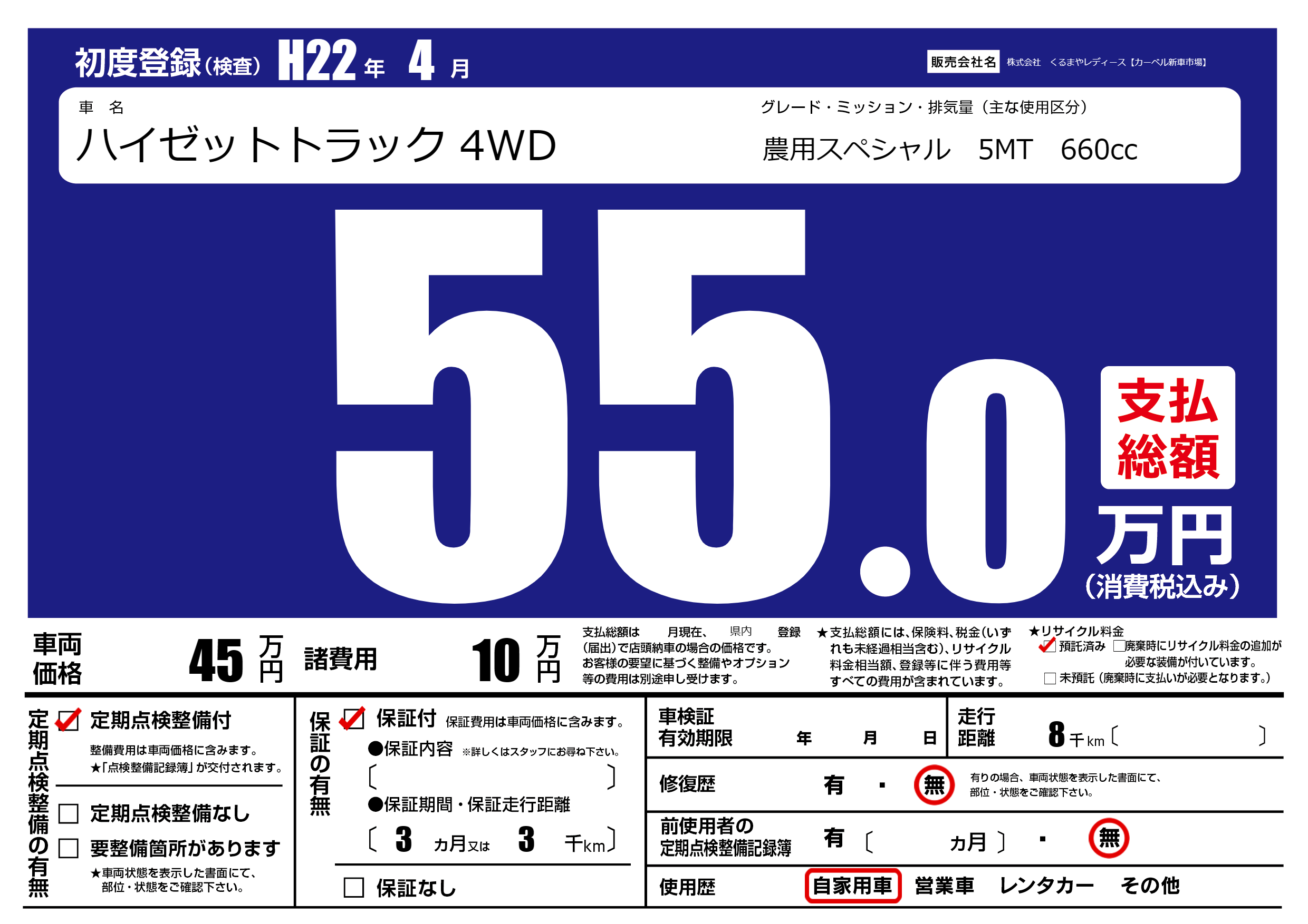 | 車名 | ハイゼットトラック 4WD | グレード ミッション 排気量 |