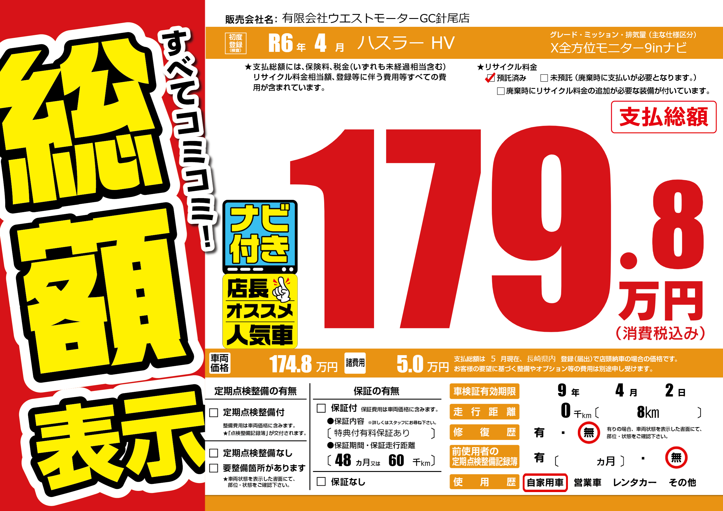 | 車名 | ハスラー HV | グレード ミッション 排気量 |