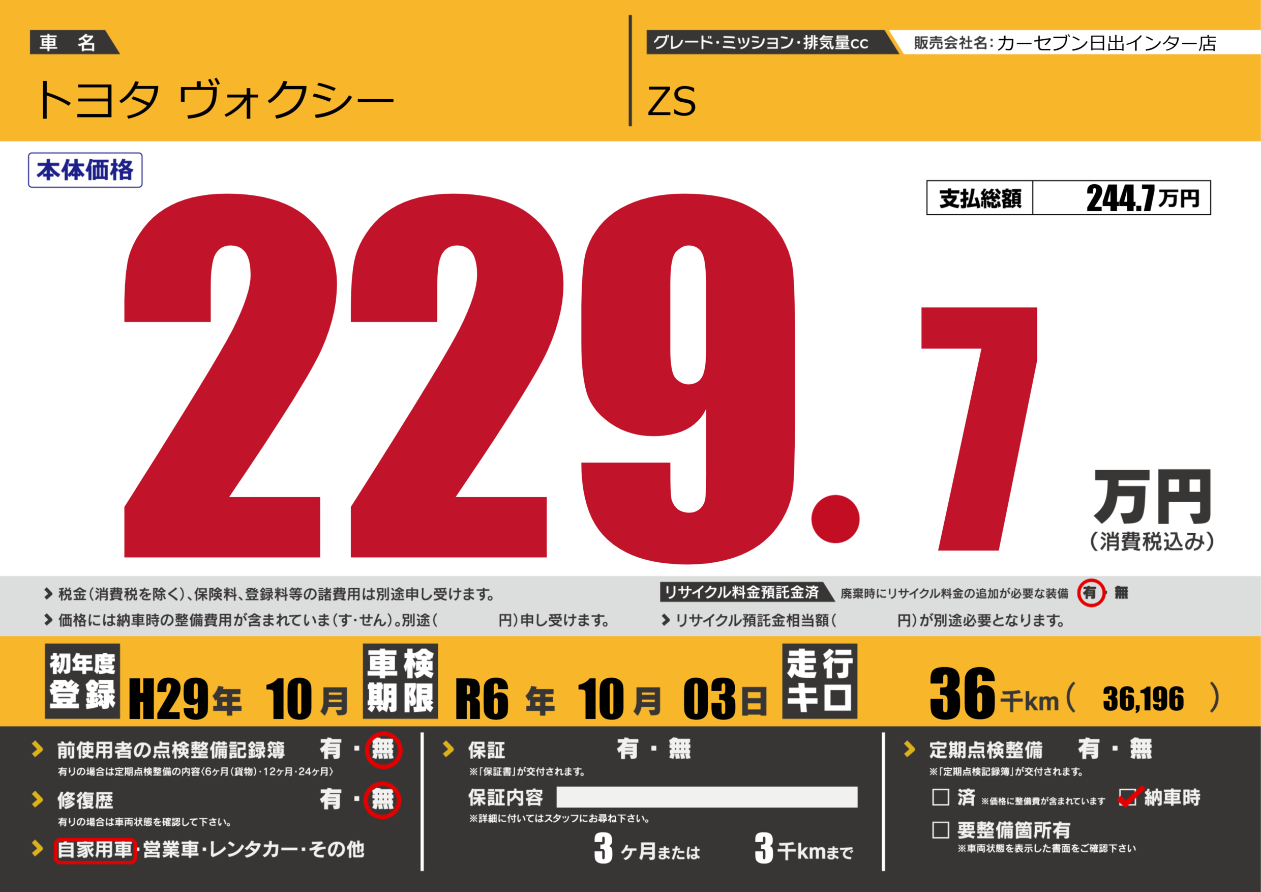 | 走行キロ | 3.6万km | 初年度登録 | H29年10月 |