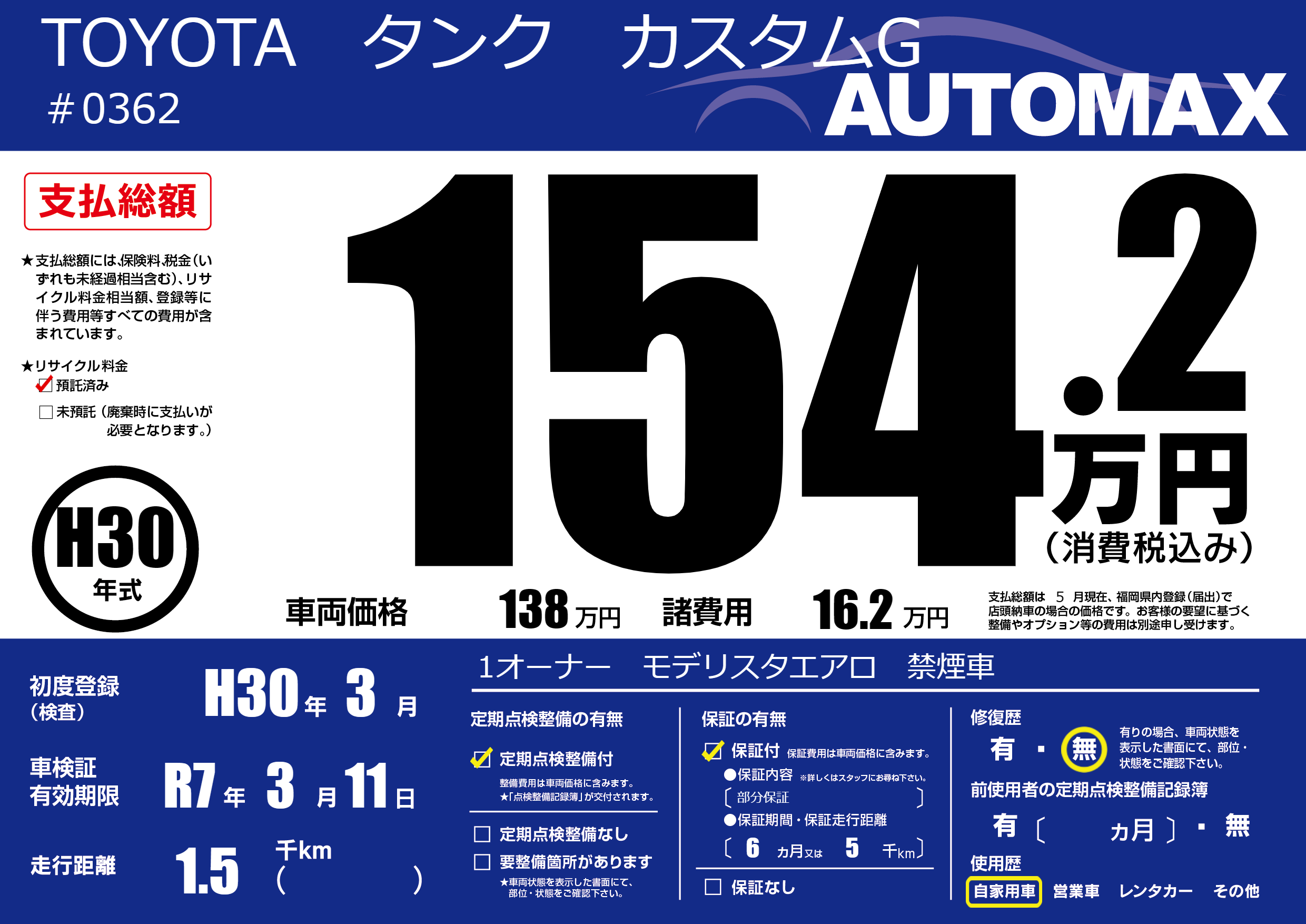 | 車名 | TOYOTA タンク カスタムG | グレード ミッション 排気量 |