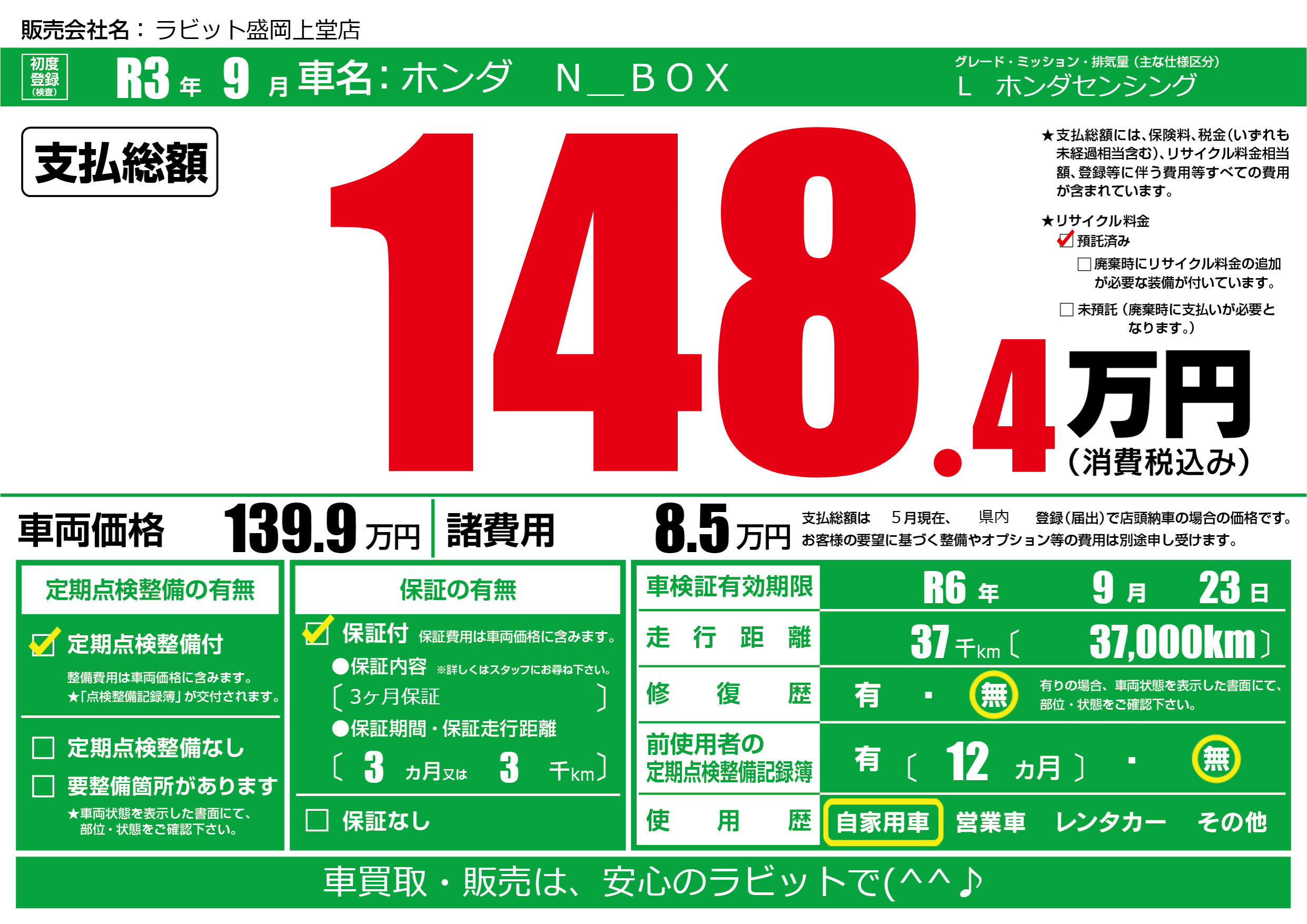 | 走行キロ | 3.7万km | 初年度登録 | R3年9月 |