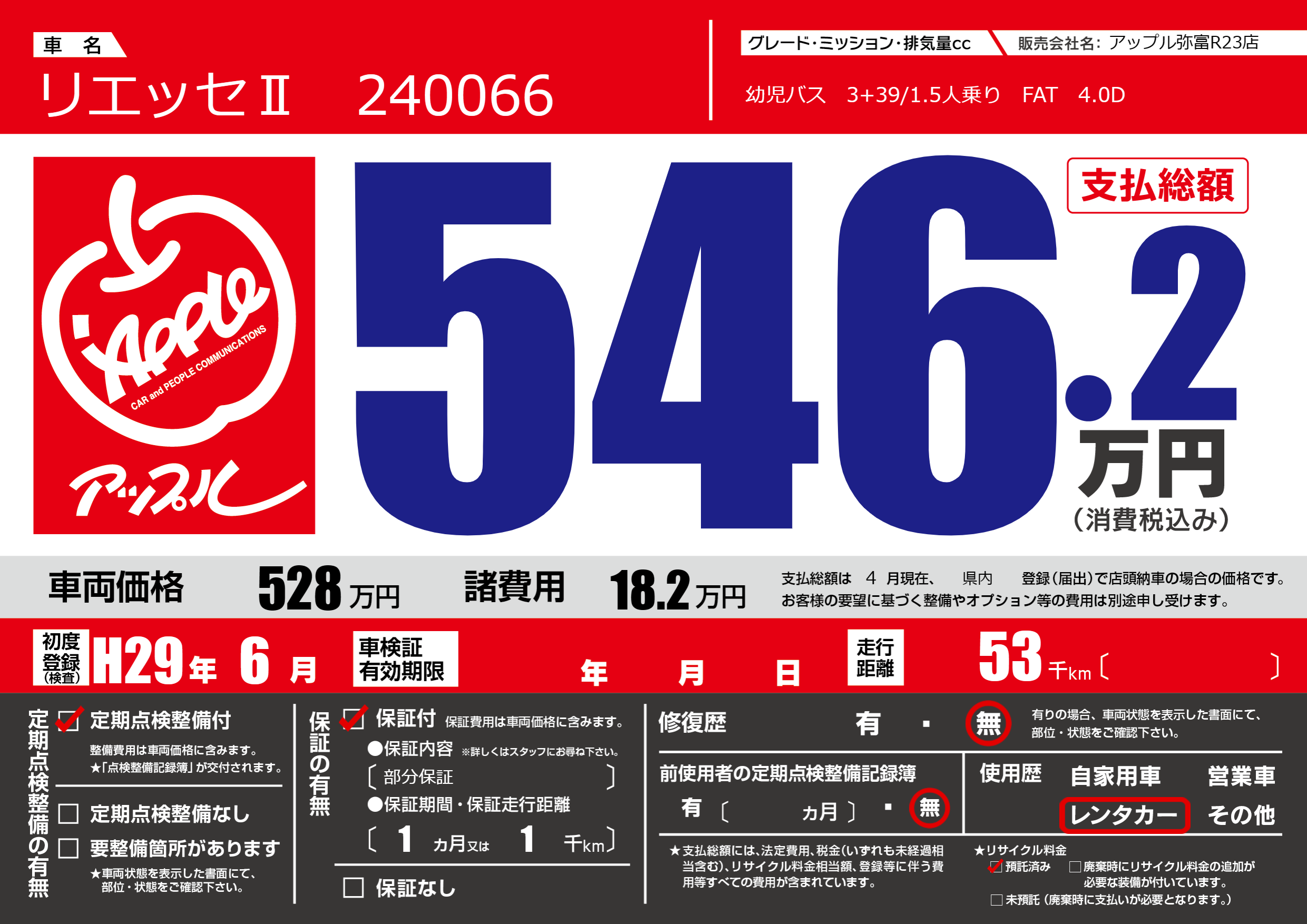 | 車名 | リエッセⅡ 240066 | グレード ミッション 排気量 |