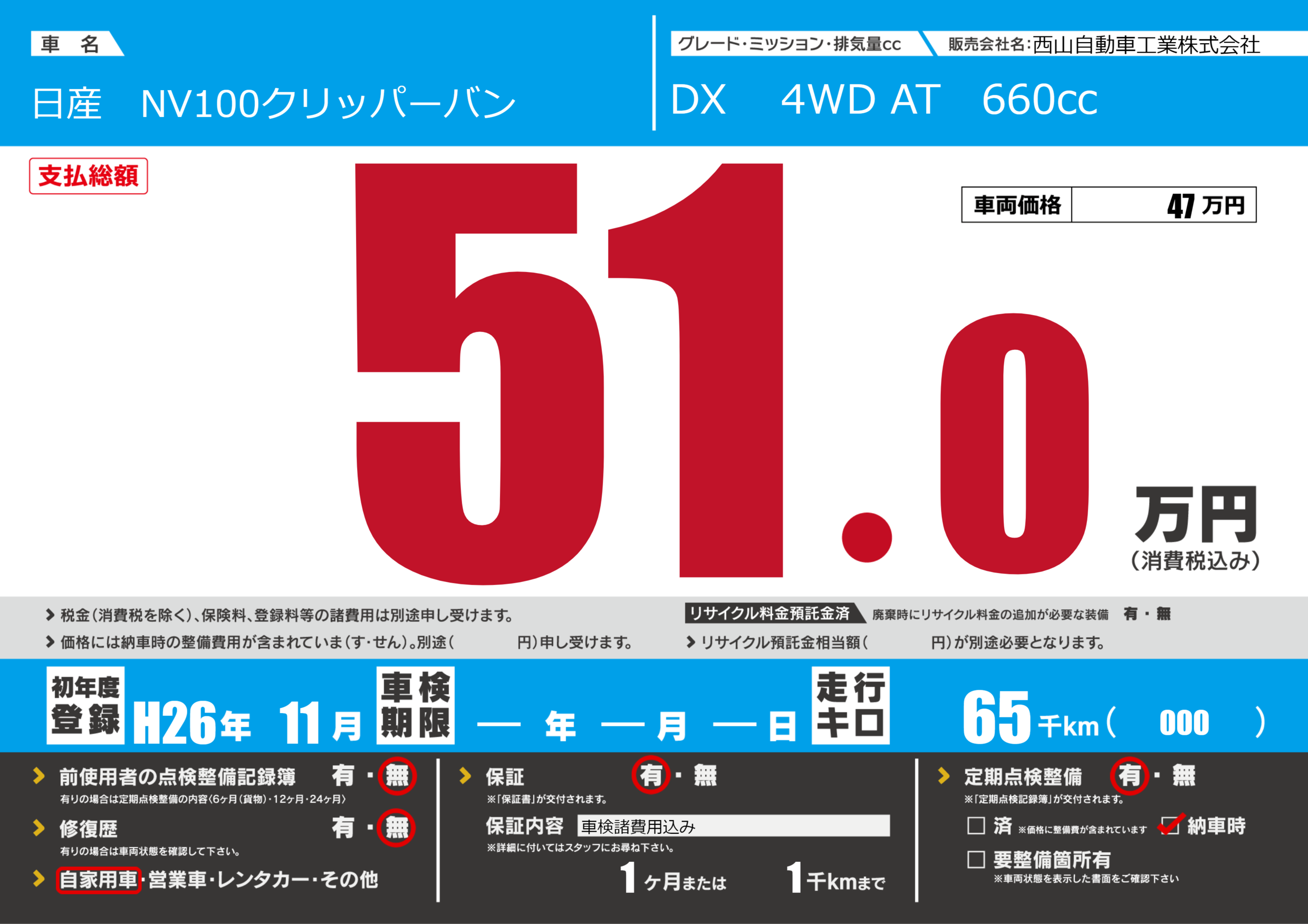 保証付き 保証内容(車検諸費用込み) 1ヶ月または(1)千kmまで |