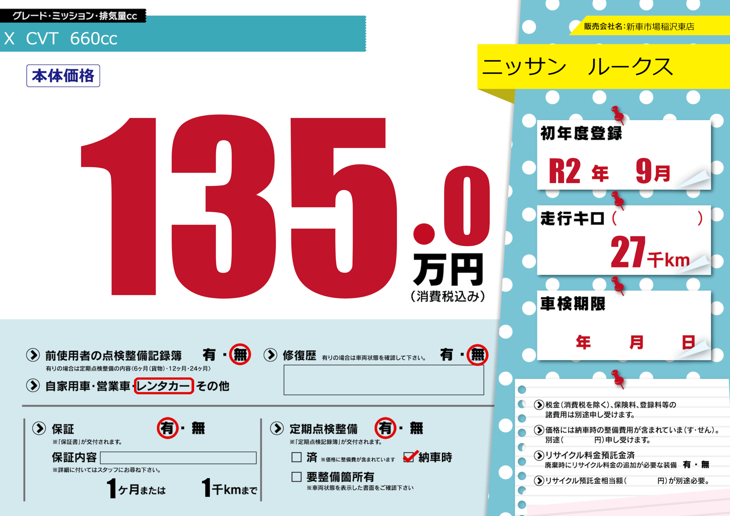 | 車名 | ニッサン ルークス | グレード ミッション 排気量 |