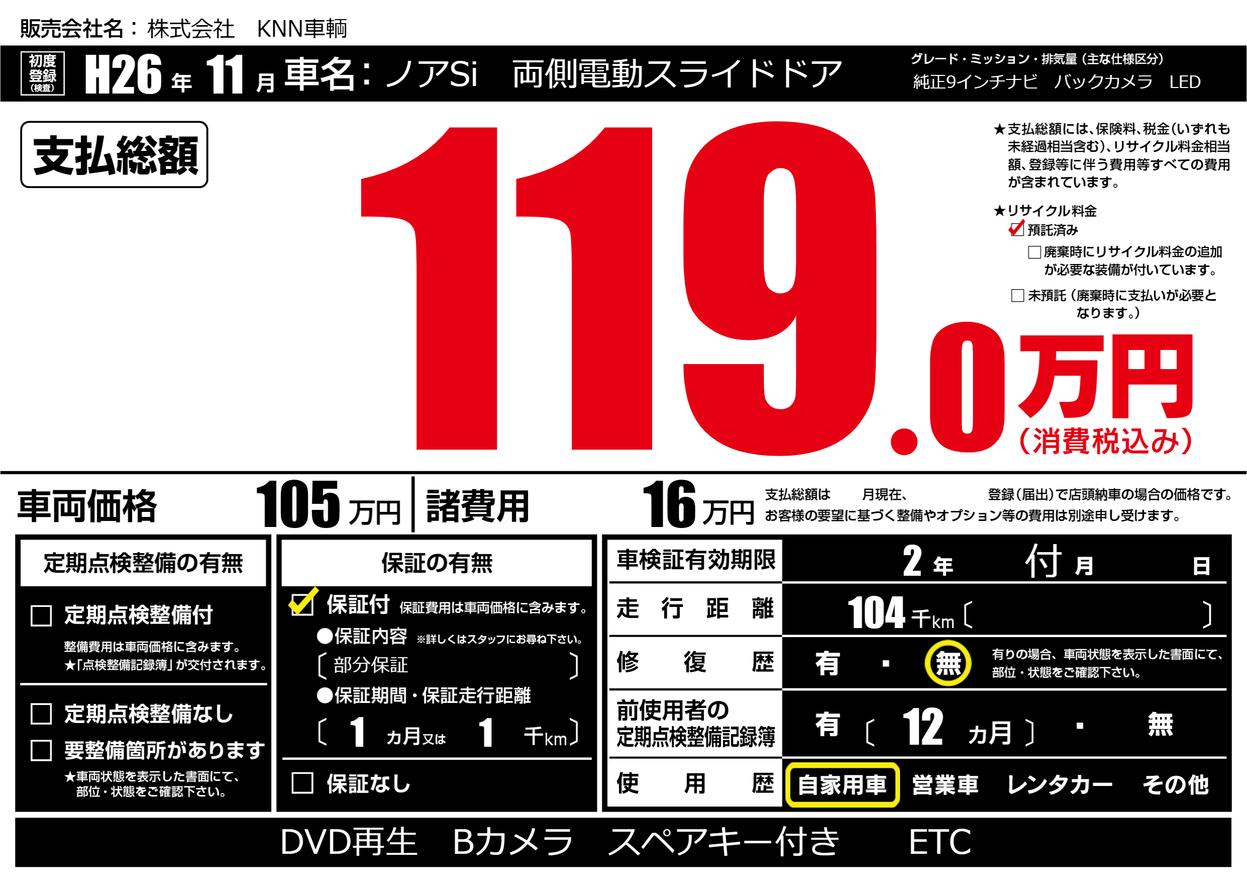 | 走行キロ | 10.4万km | 初年度登録 | H26年11月 |