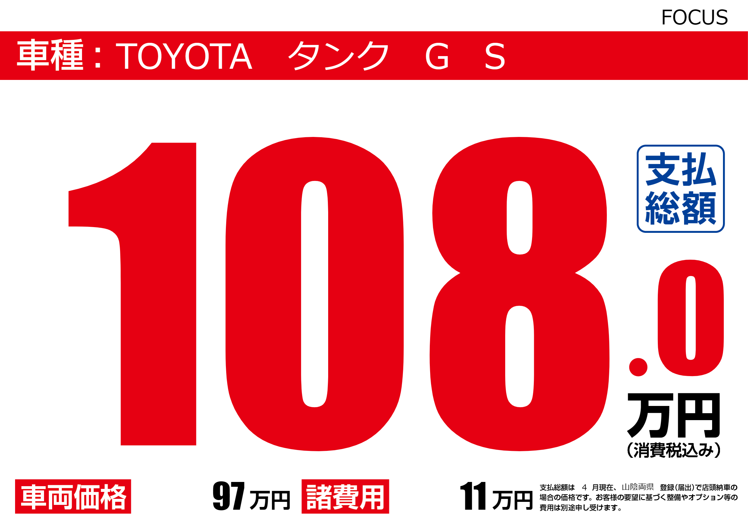 | 車名 | TOYOTA タンク G S | グレード ミッション 排気量 |