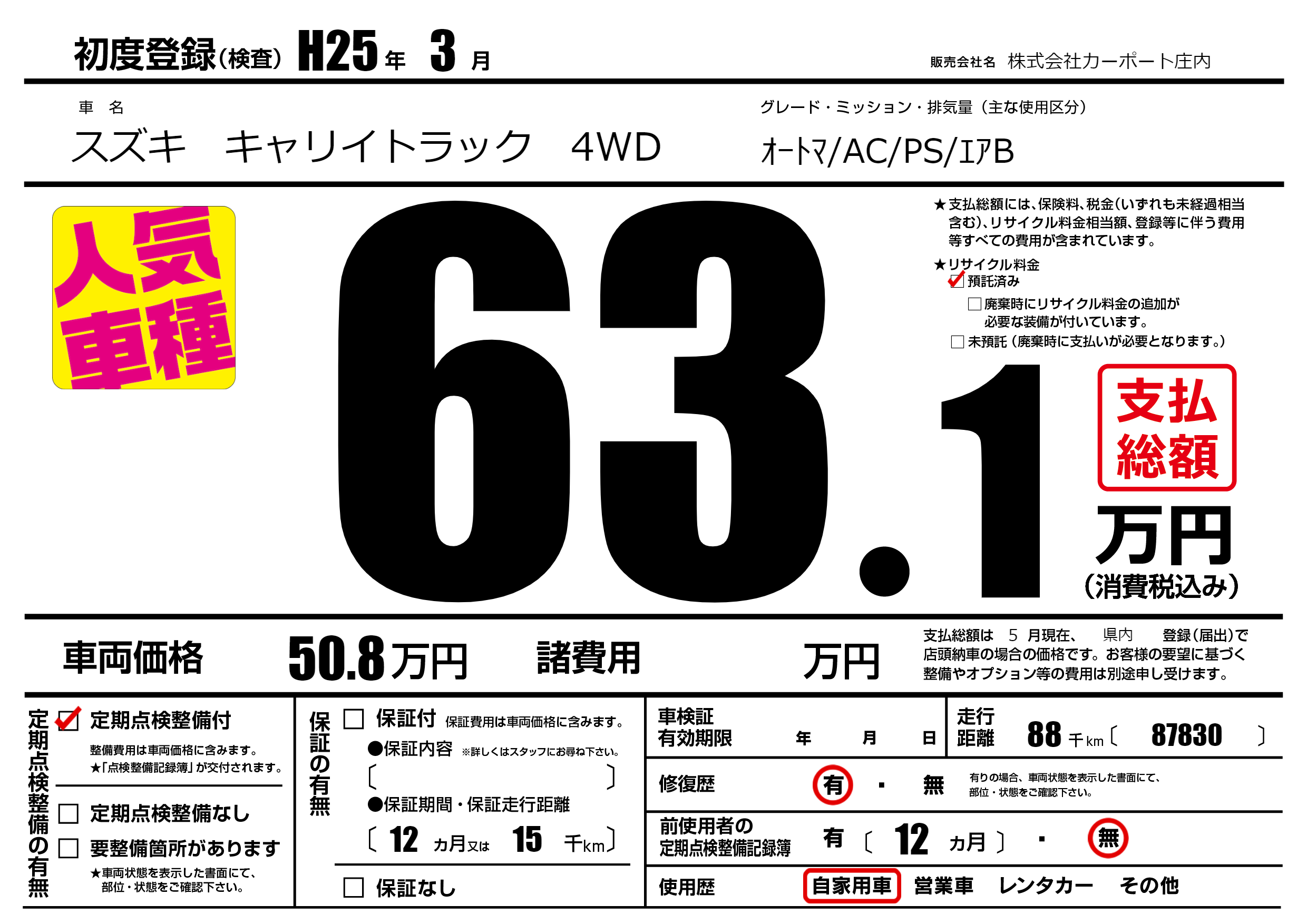 | 車名 | スズキ キャリイトラック 4WD | グレード ミッション 排気量 |