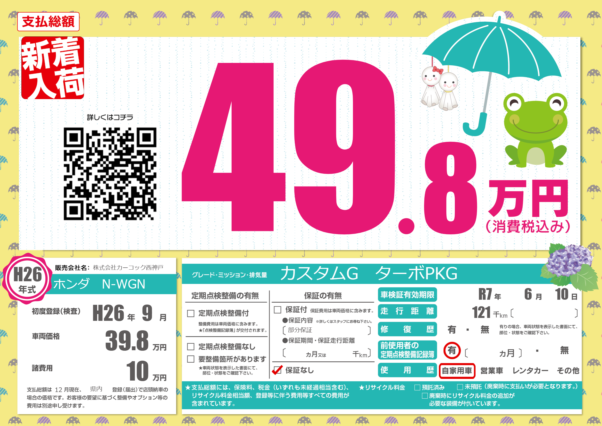 | 走行キロ | 12.1万km | 初年度登録 | H26年9月 |