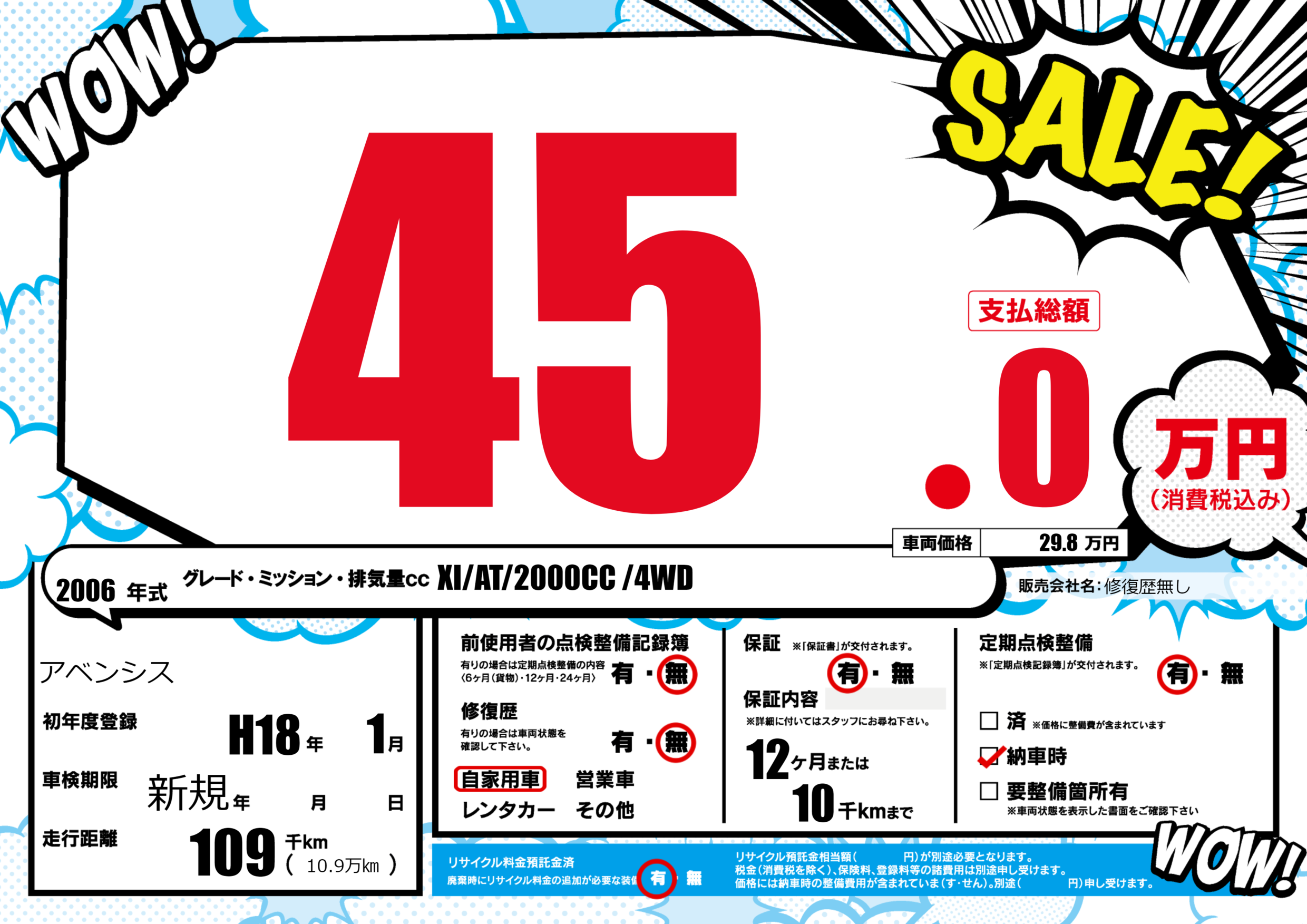 | 走行キロ | 10.9万km | 初年度登録 | H18年1月 |