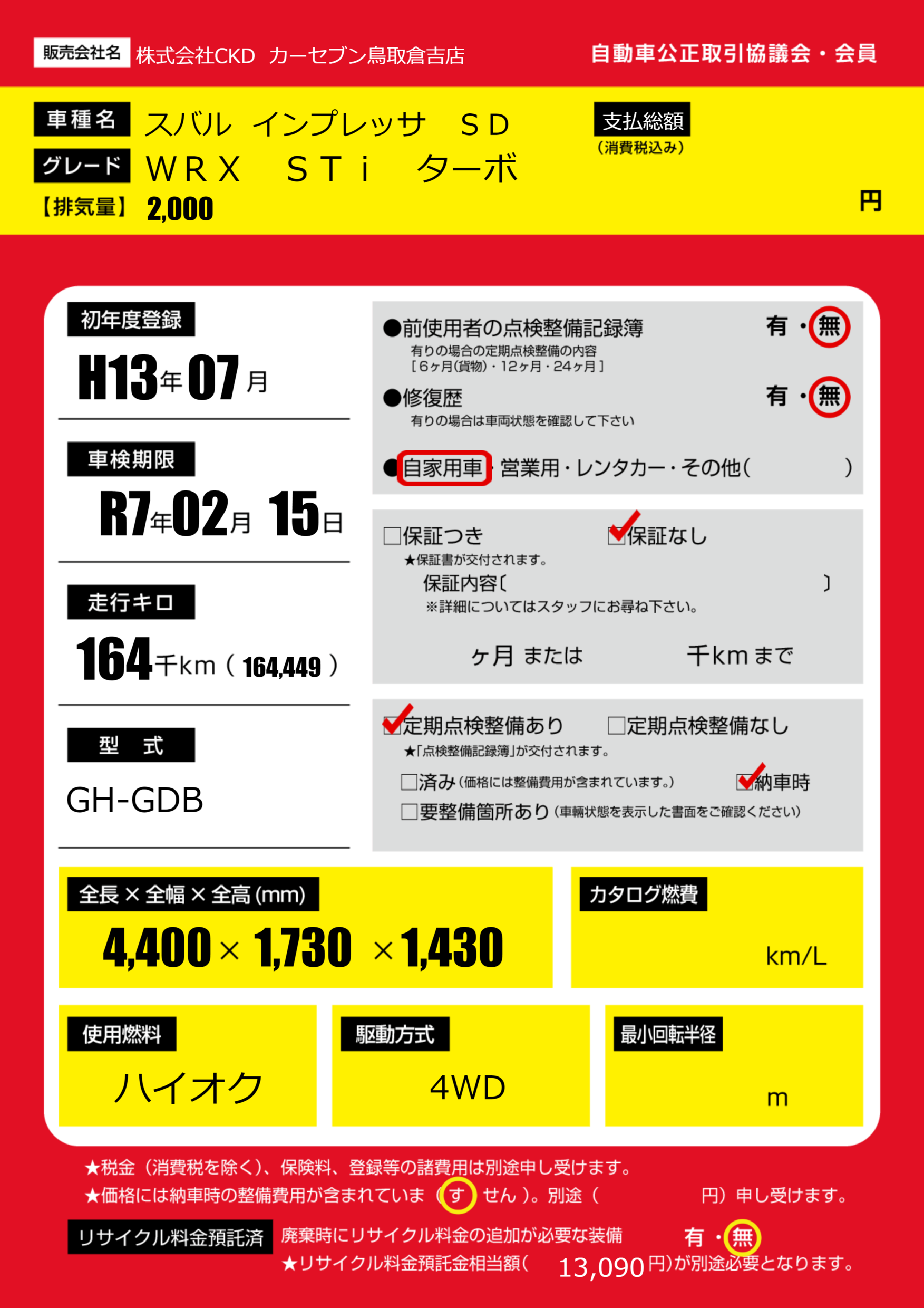 | 走行キロ | 16.4万km | 初年度登録 | H13年07月 |