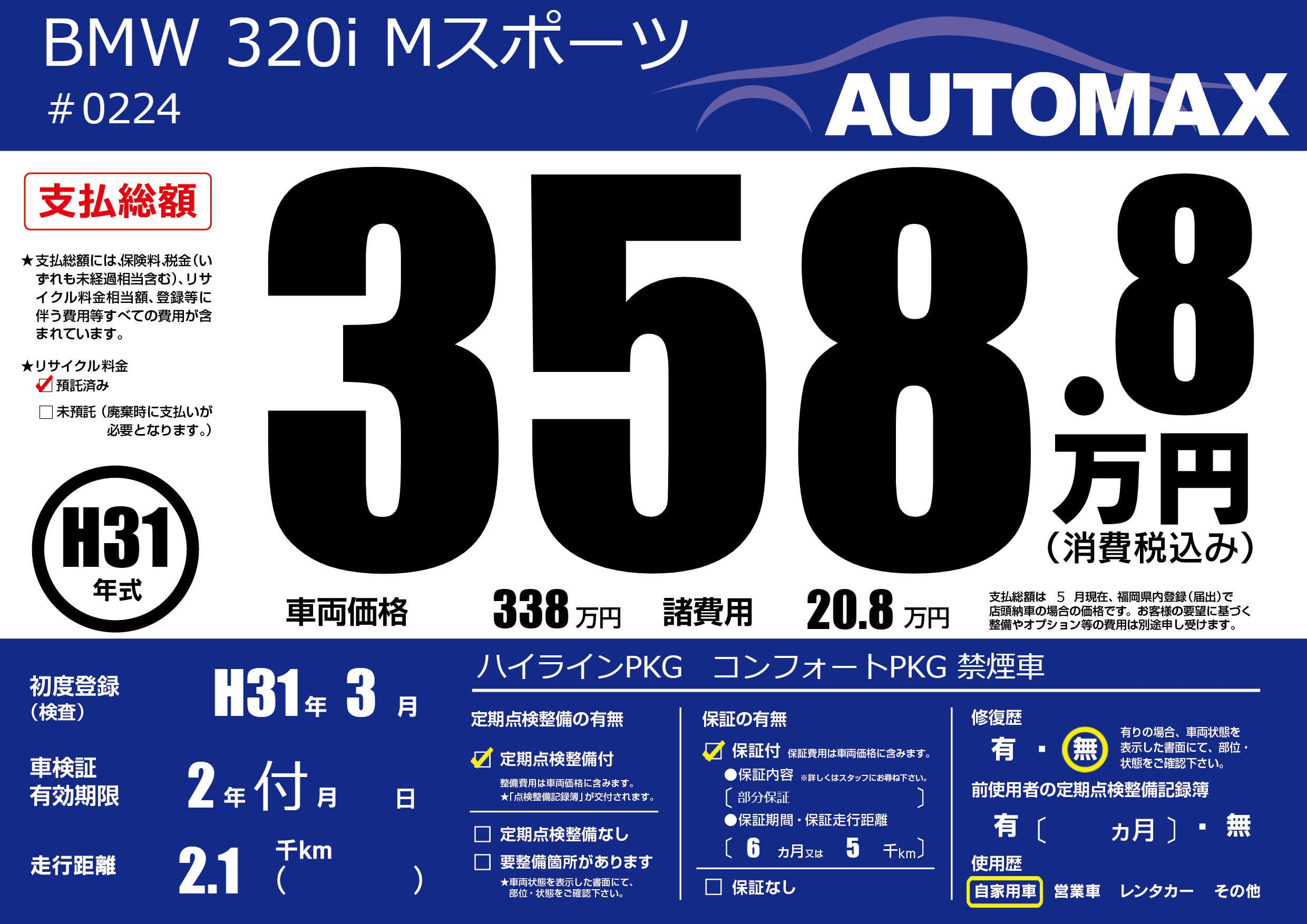 | 車名 | BMW 320i Mスポーツ | グレード ミッション 排気量 |