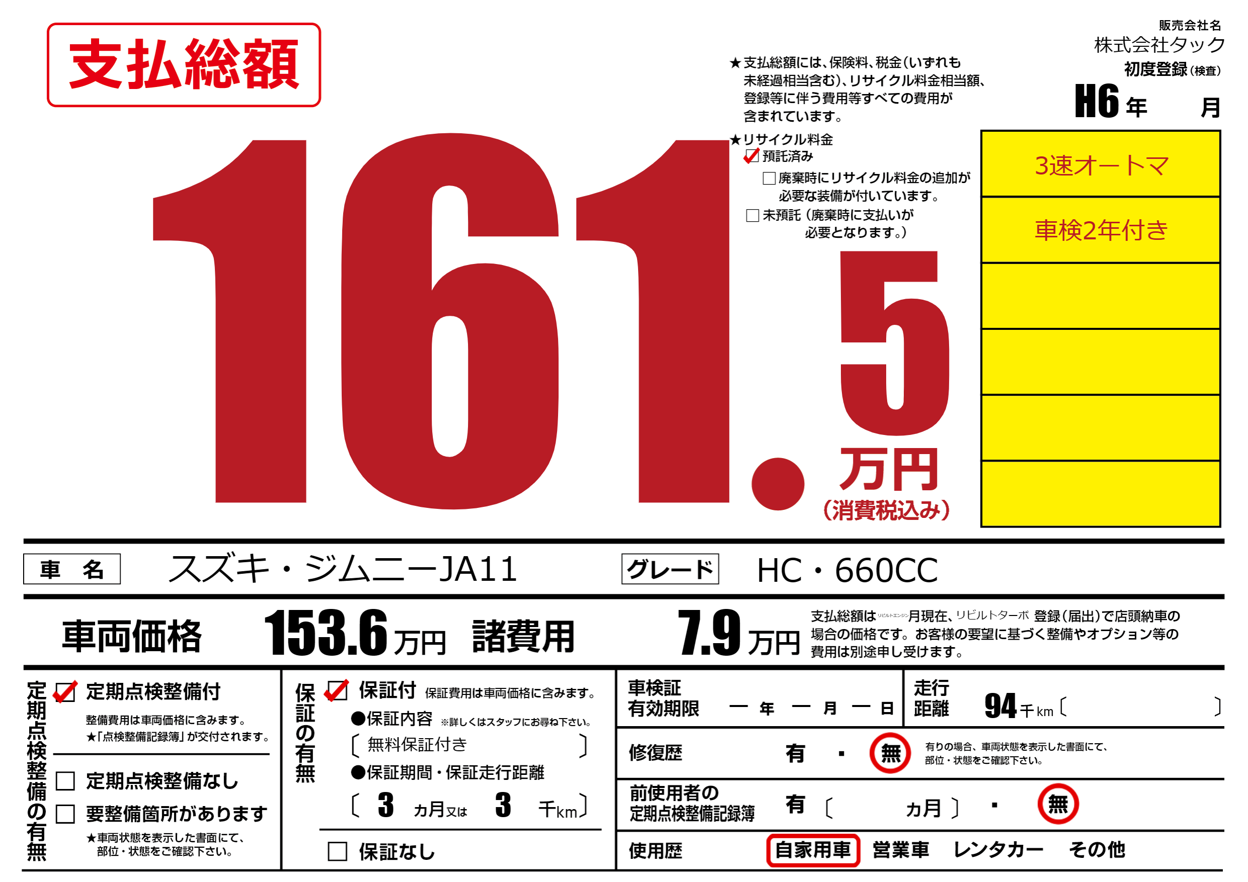 | 車名 | スズキ・ジムニーJA11 | グレード ミッション 排気量 |