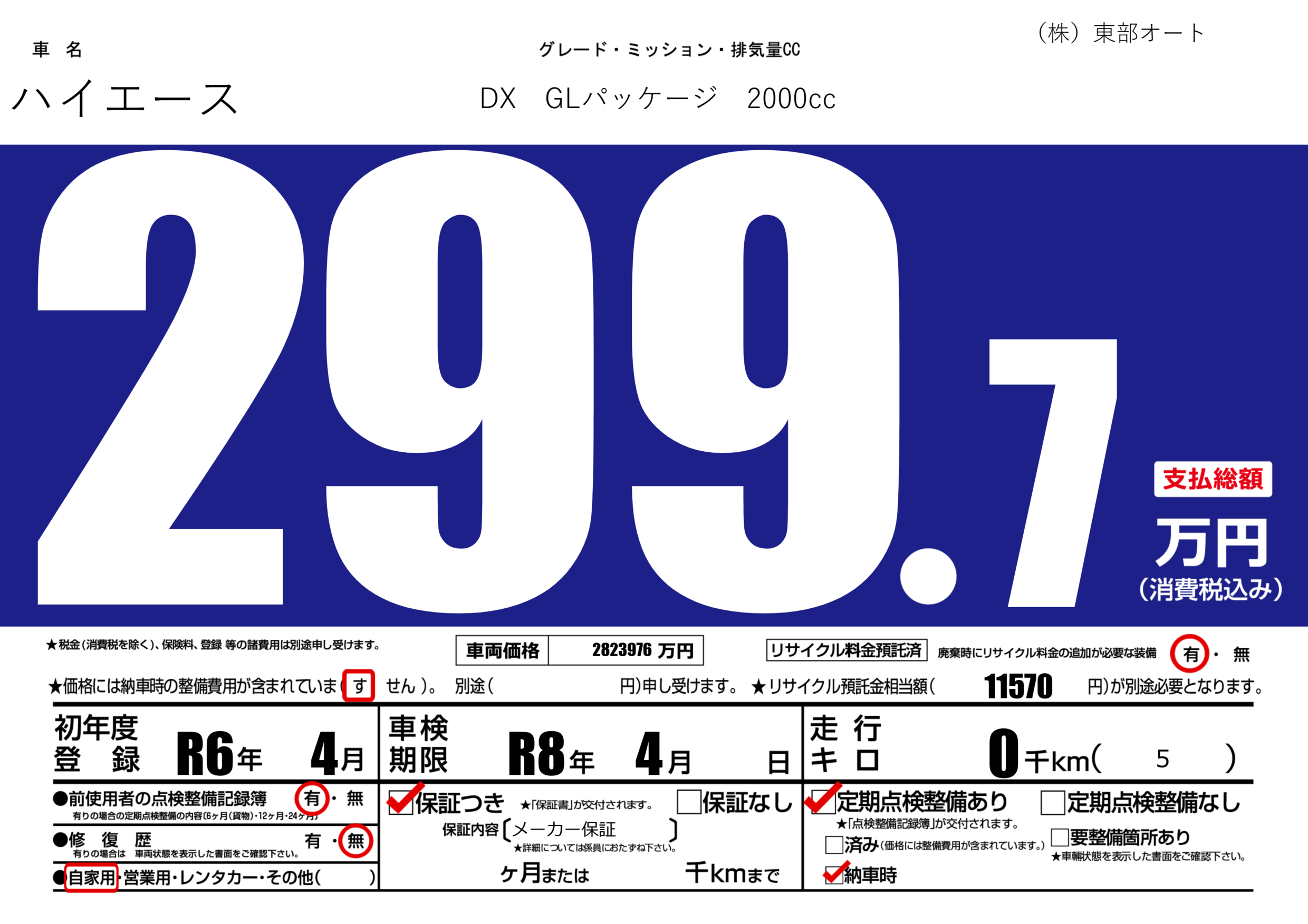 | 車名 | ハイエース | グレード ミッション 排気量 |