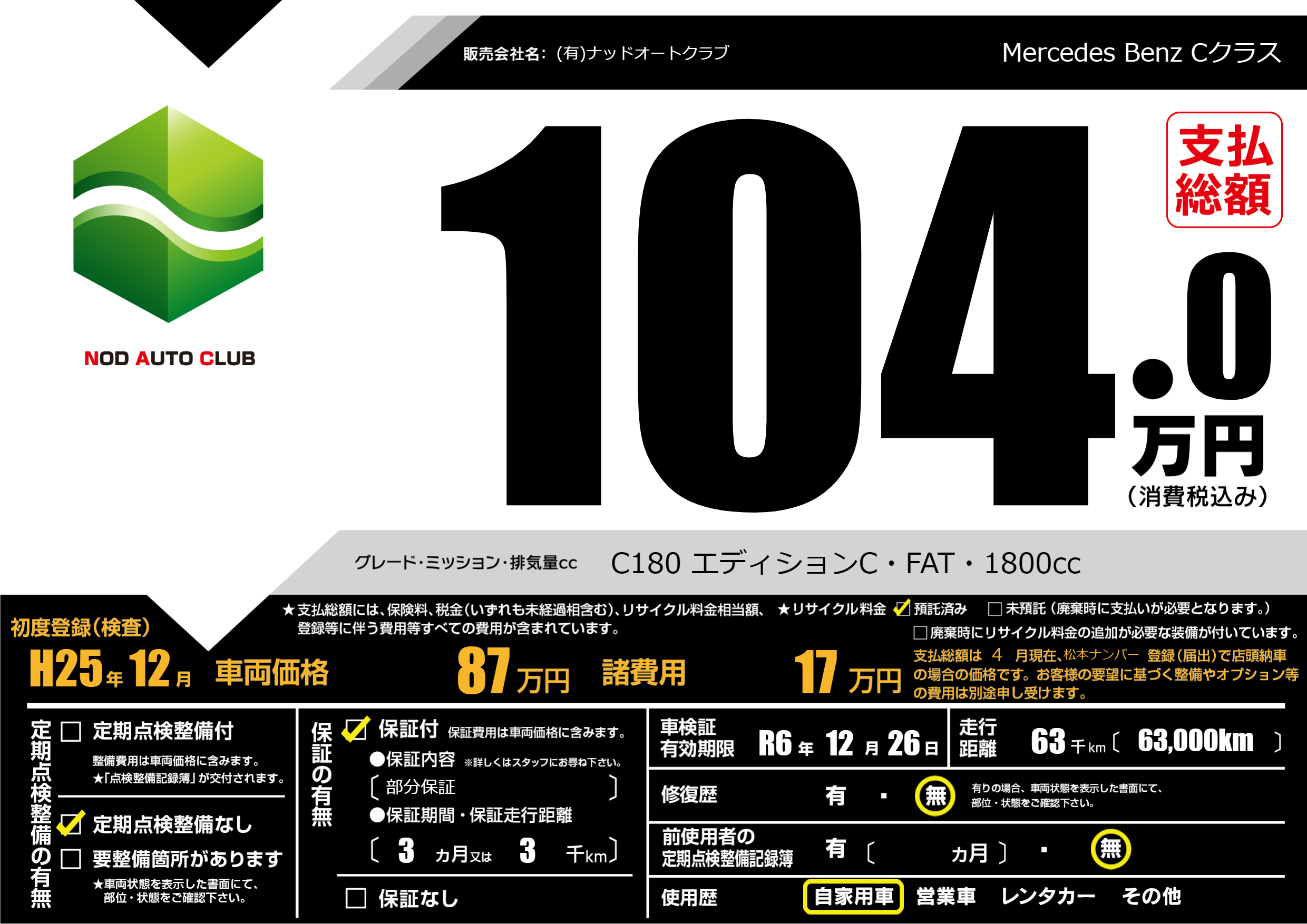 | 車名 | Mercedes Benz Cクラス | グレード ミッション 排気量 |
