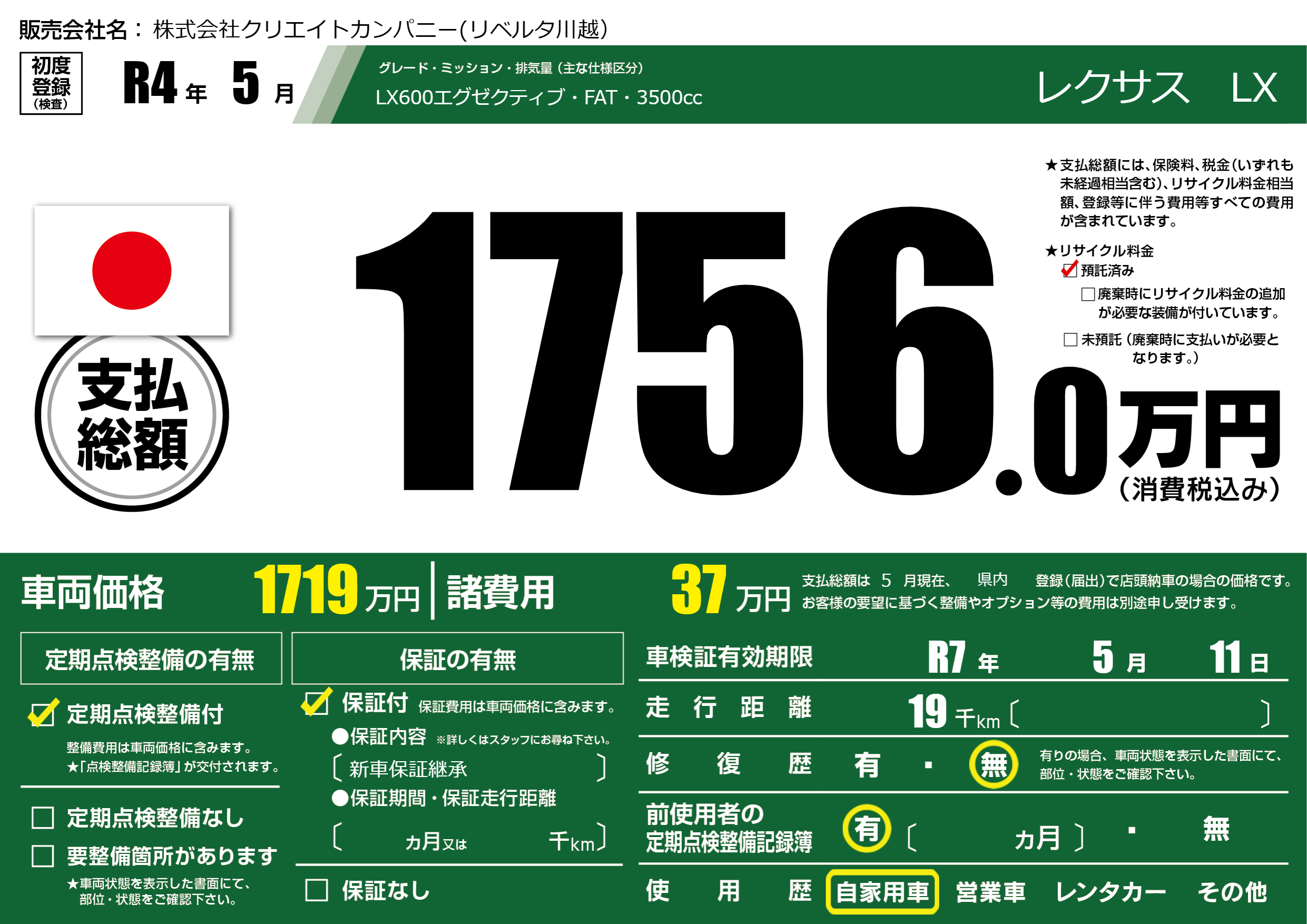 | 車名 | レクサス LX | グレード ミッション 排気量 |