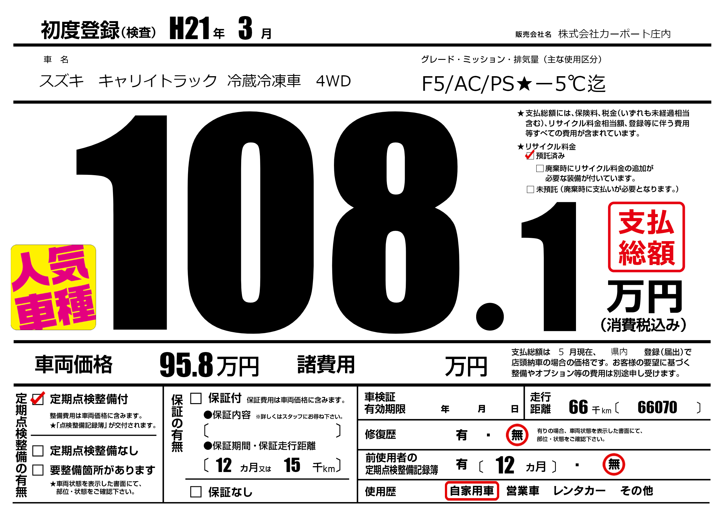 | 走行キロ | 6.6万km | 初年度登録 | H21年3月 |