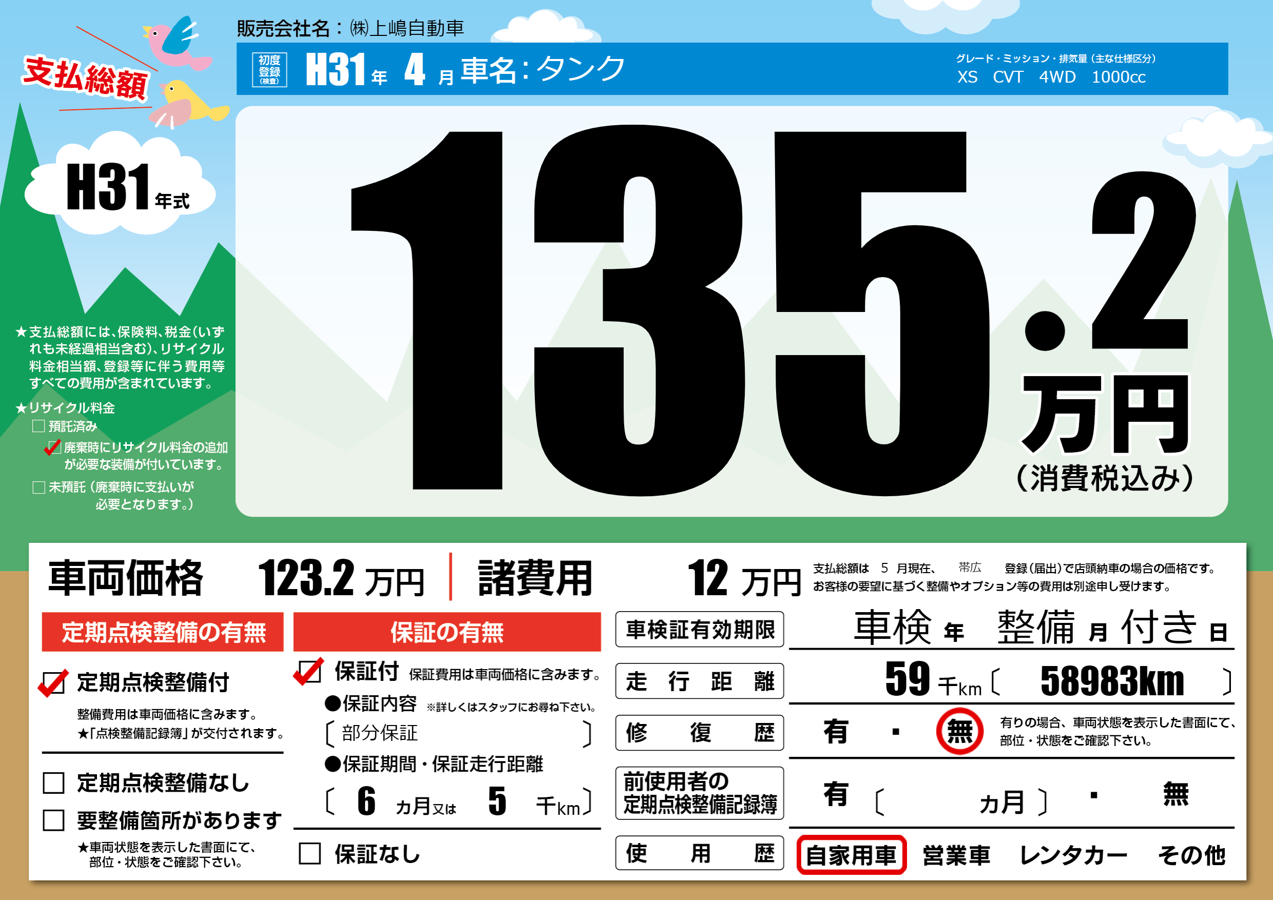 | 走行キロ | 5.9万km | 初年度登録 | H31年4月 |