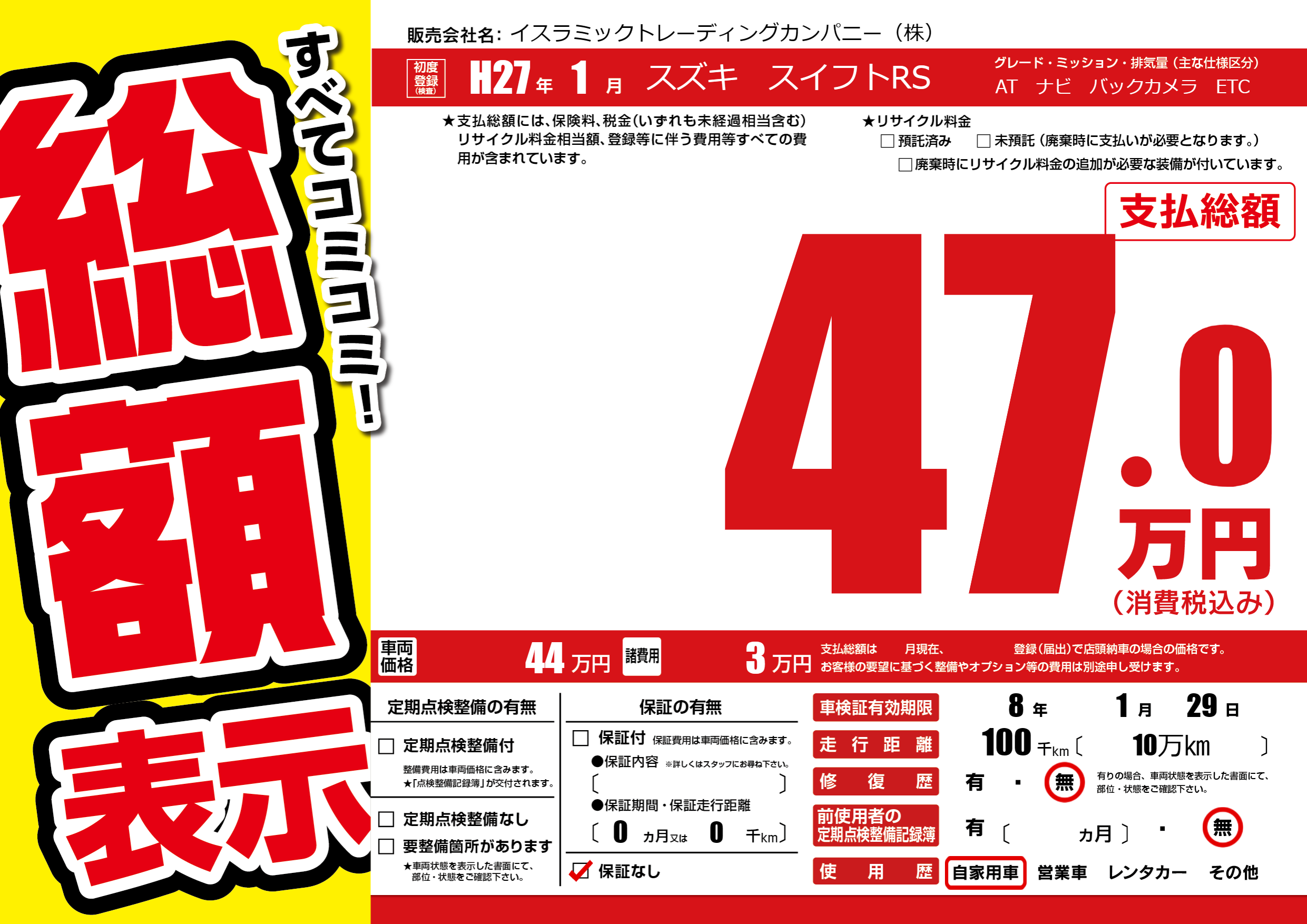 | 走行キロ | 10万km | 初年度登録 | H27年1月 |