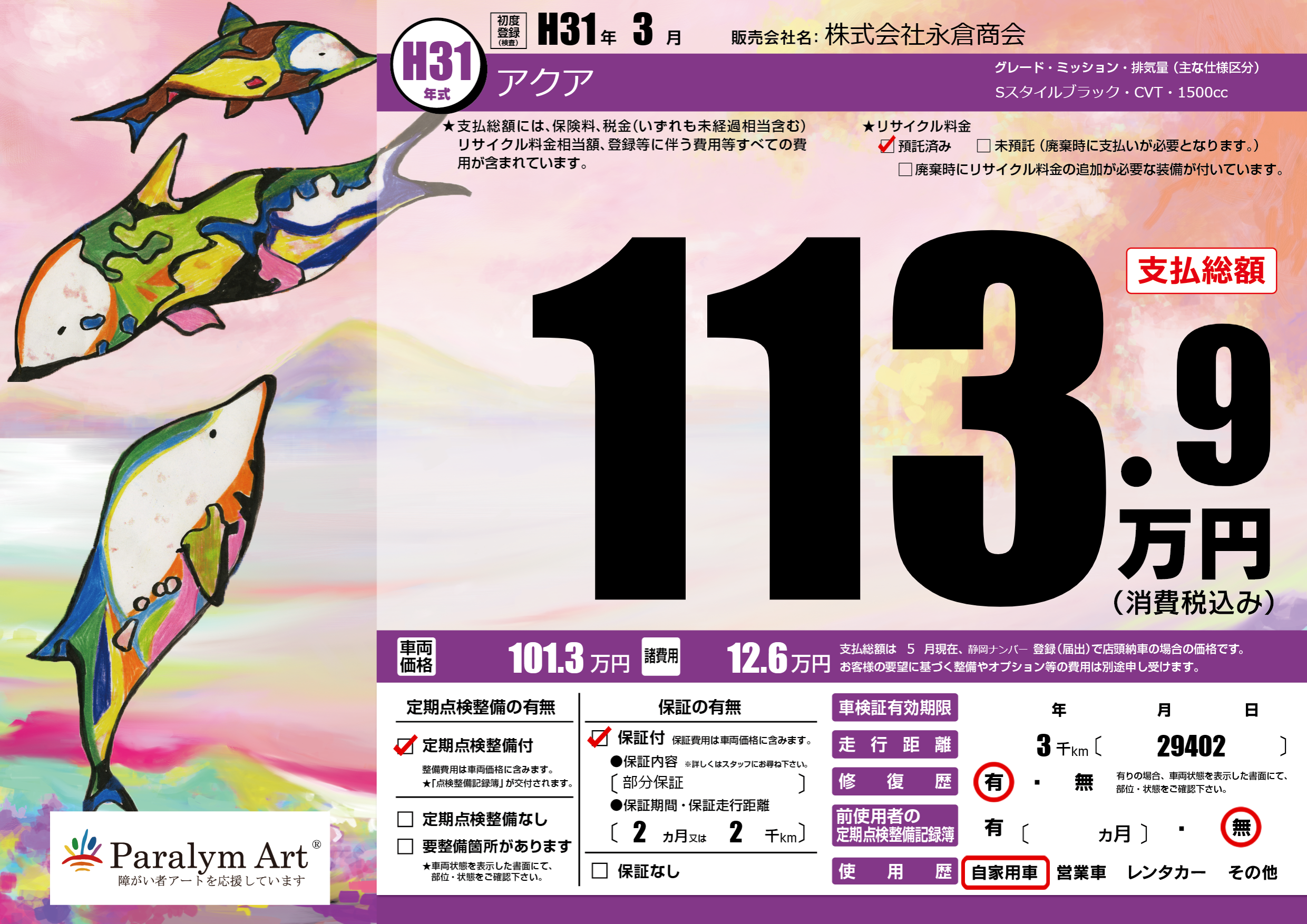 | 走行キロ | 0.3万km | 初年度登録 | H31年3月 |
