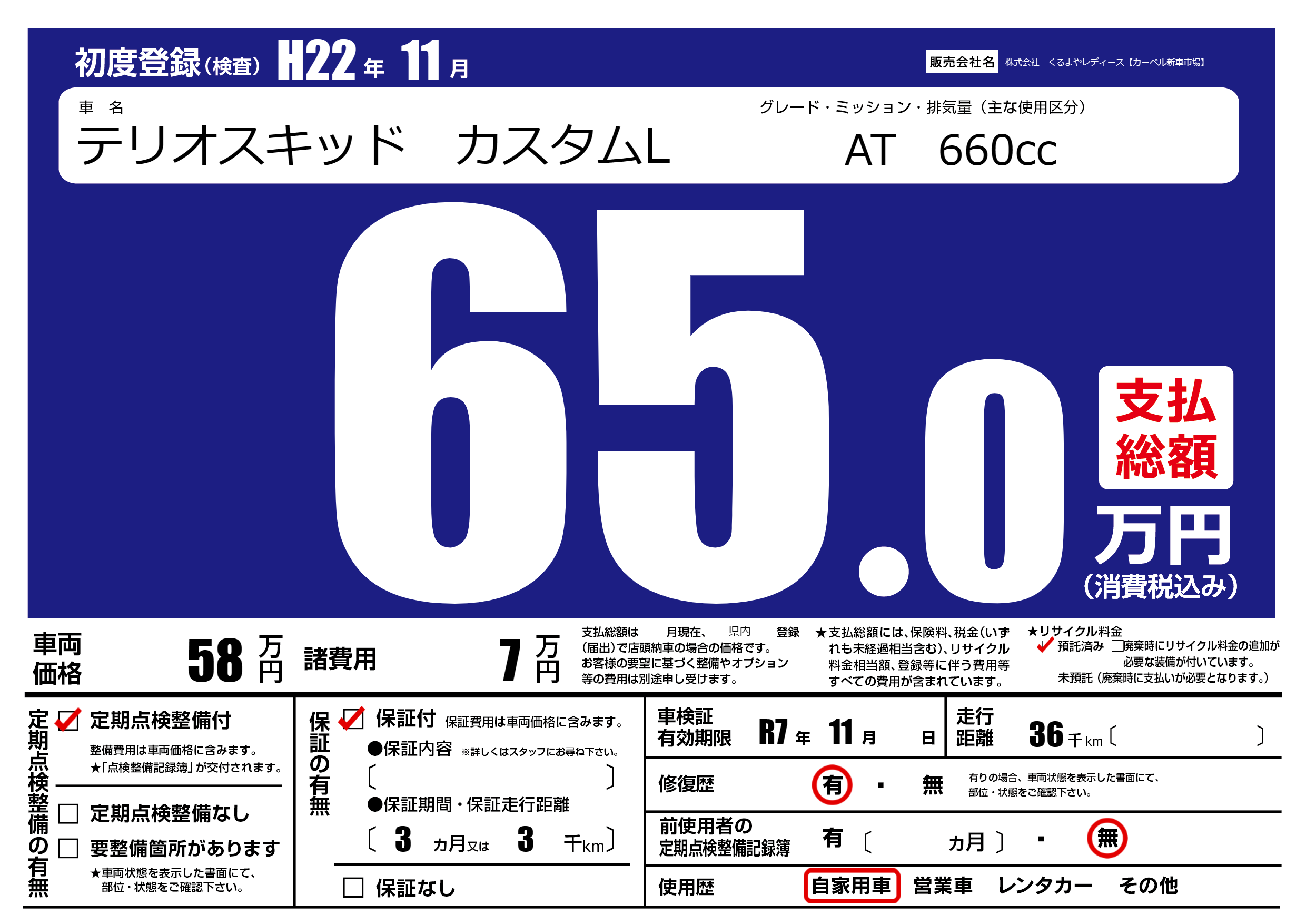 | 走行キロ | 3.6万km | 初年度登録 | H22年11月 |