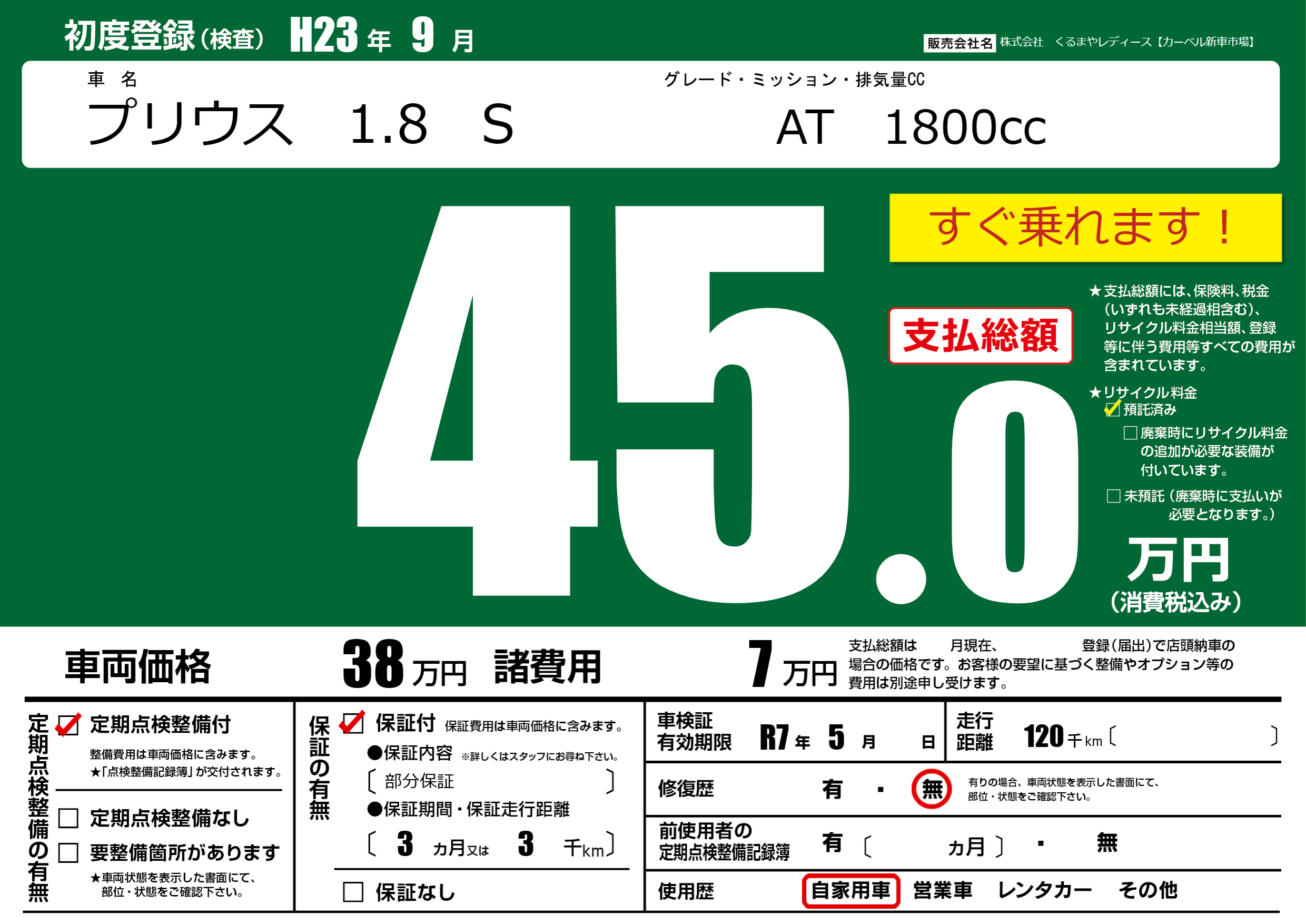 | 走行キロ | 12万km | 初年度登録 | H23年9月 |