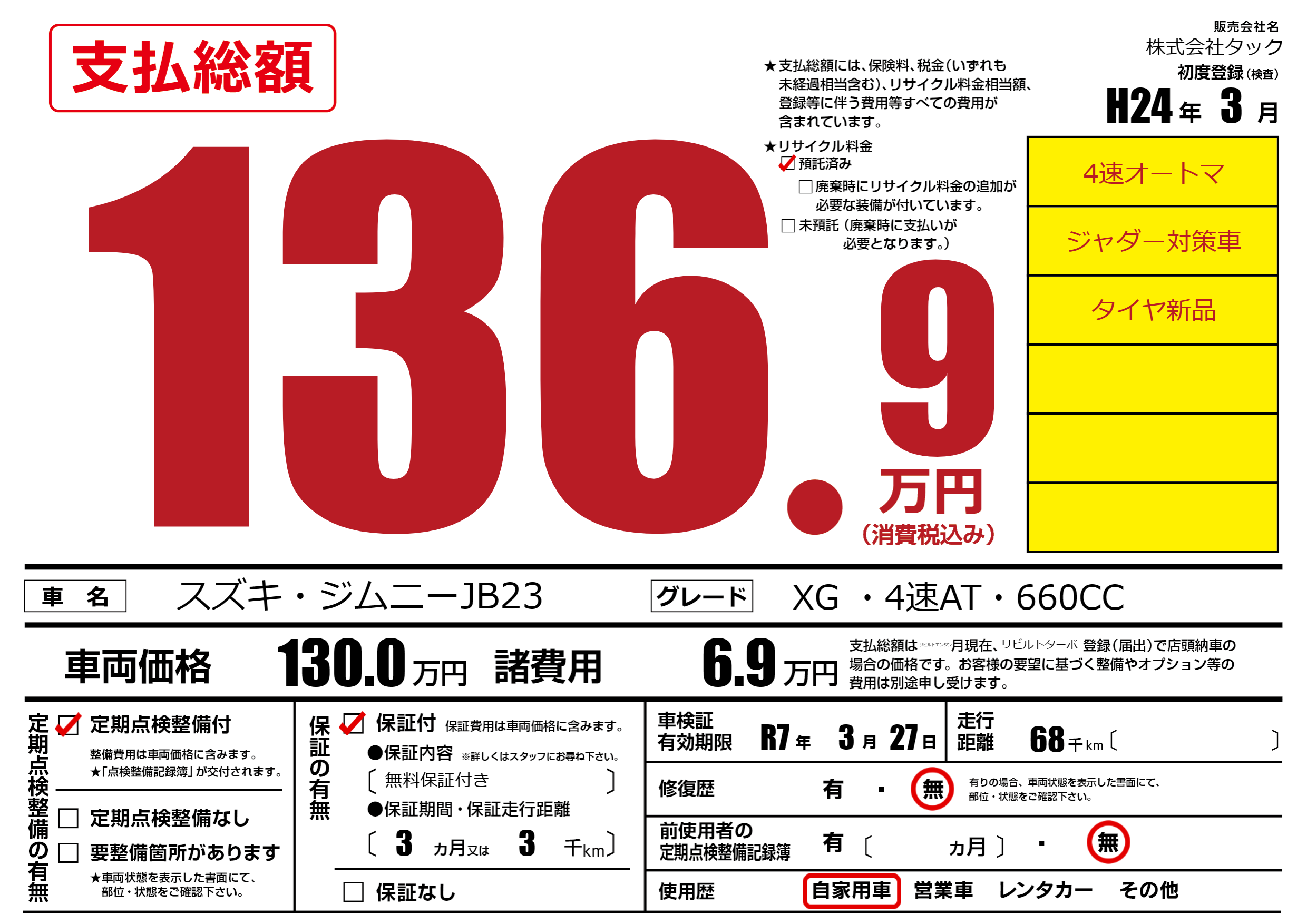 | 走行キロ | 6.8万km | 初年度登録 | H24年3月 |