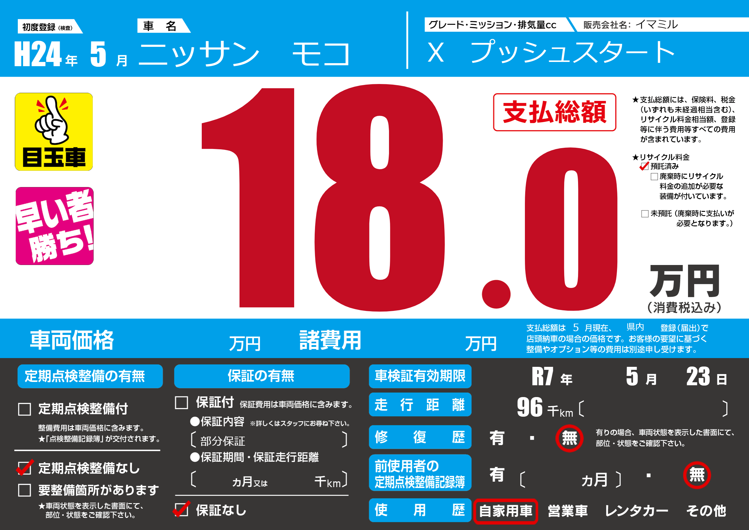 | 走行キロ | 9.6万km | 初年度登録 | H24年5月 |