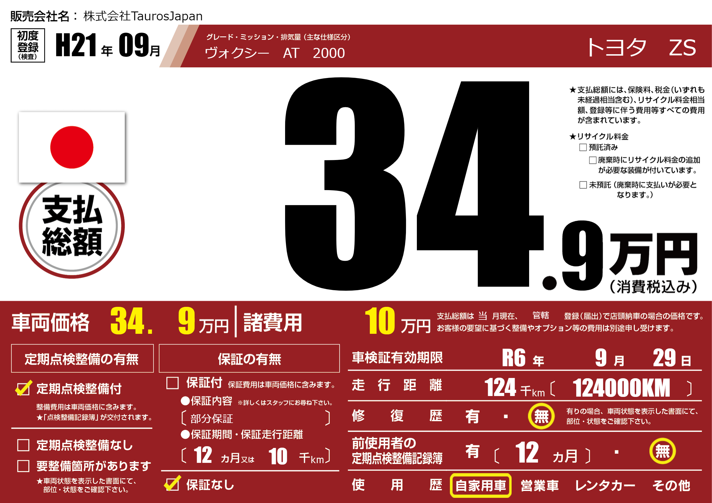 | 走行キロ | 12.4万km | 初年度登録 | H21年09月 |
