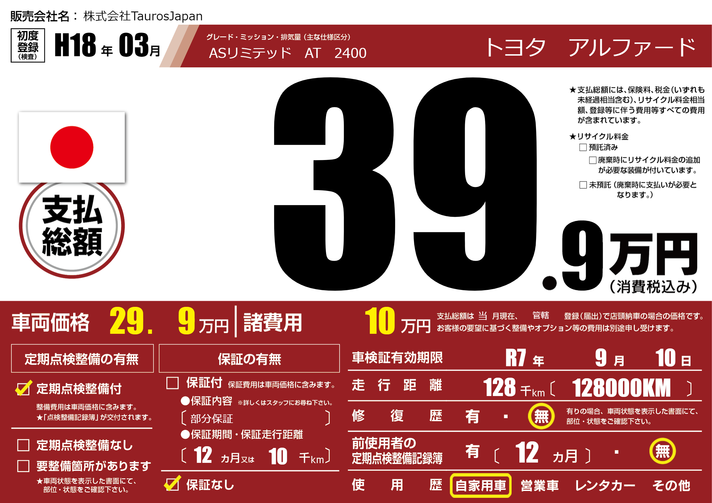 | 車検制限 | R7年 9月 10日 | ||