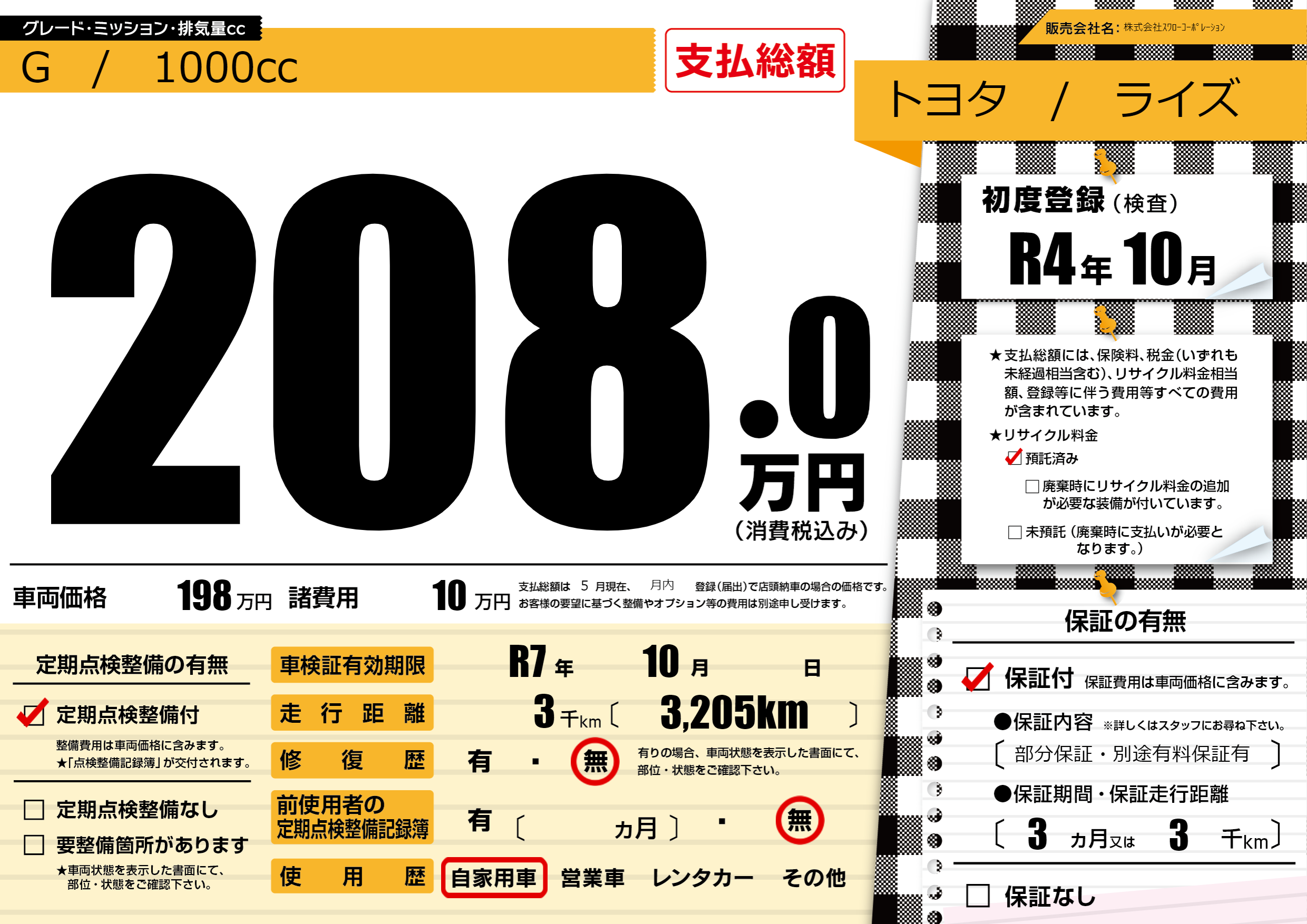 | 車名 | トヨタ / ライズ | グレード ミッション 排気量 |