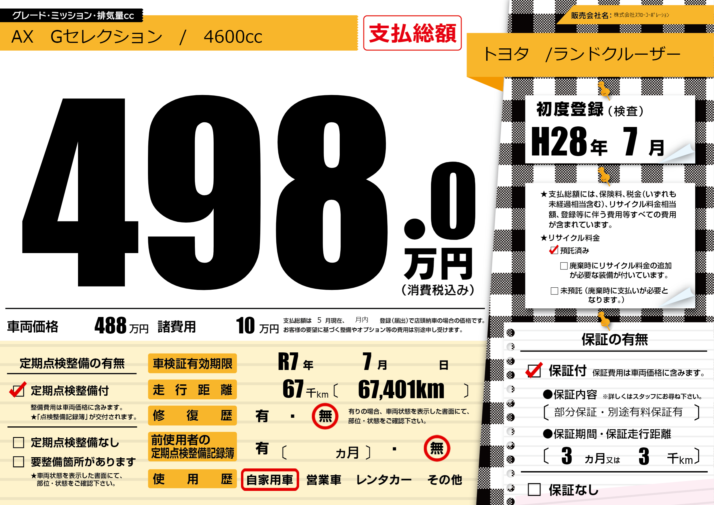 | 走行キロ | 6.7万km | 初年度登録 | H28年7月 |