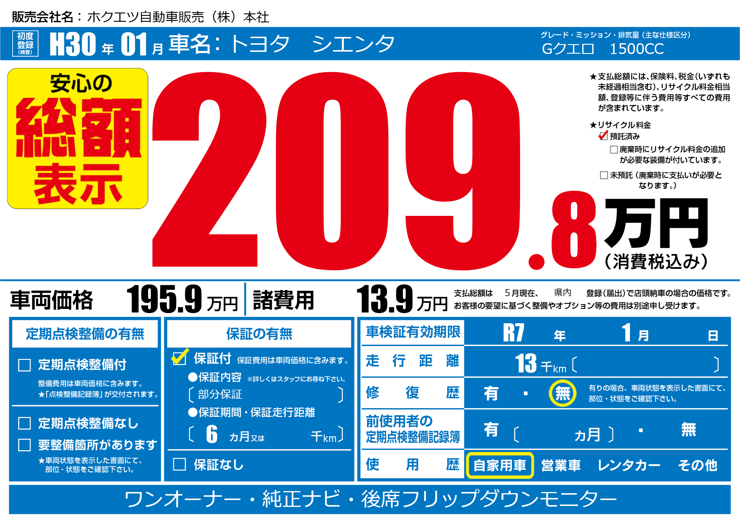 | 車名 | トヨタ シエンタ | グレード ミッション 排気量 |
