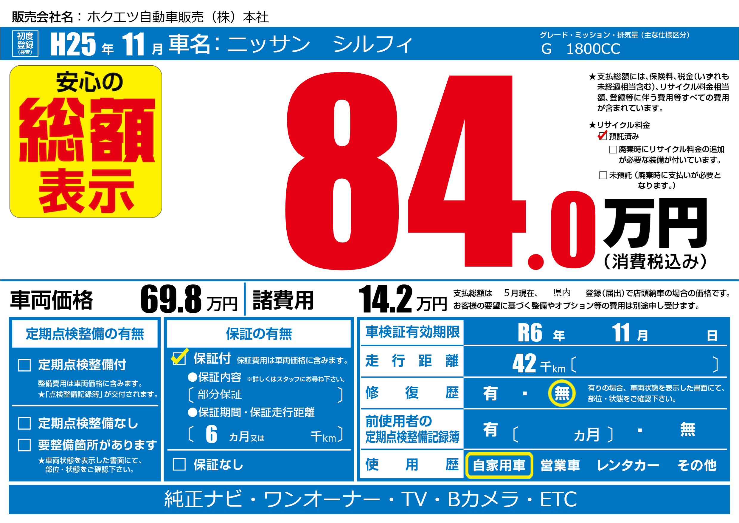| 走行キロ | 4.2万km | 初年度登録 | H25年11月 |