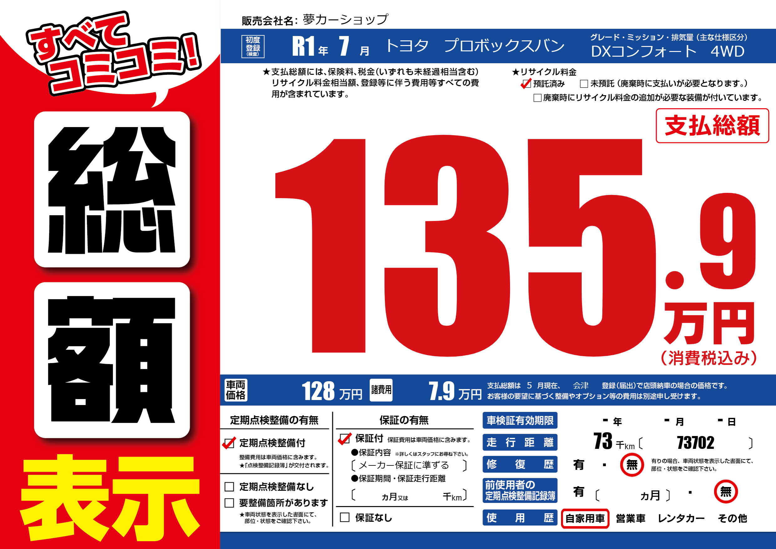 | 車名 | トヨタ プロボックスバン | グレード ミッション 排気量 |