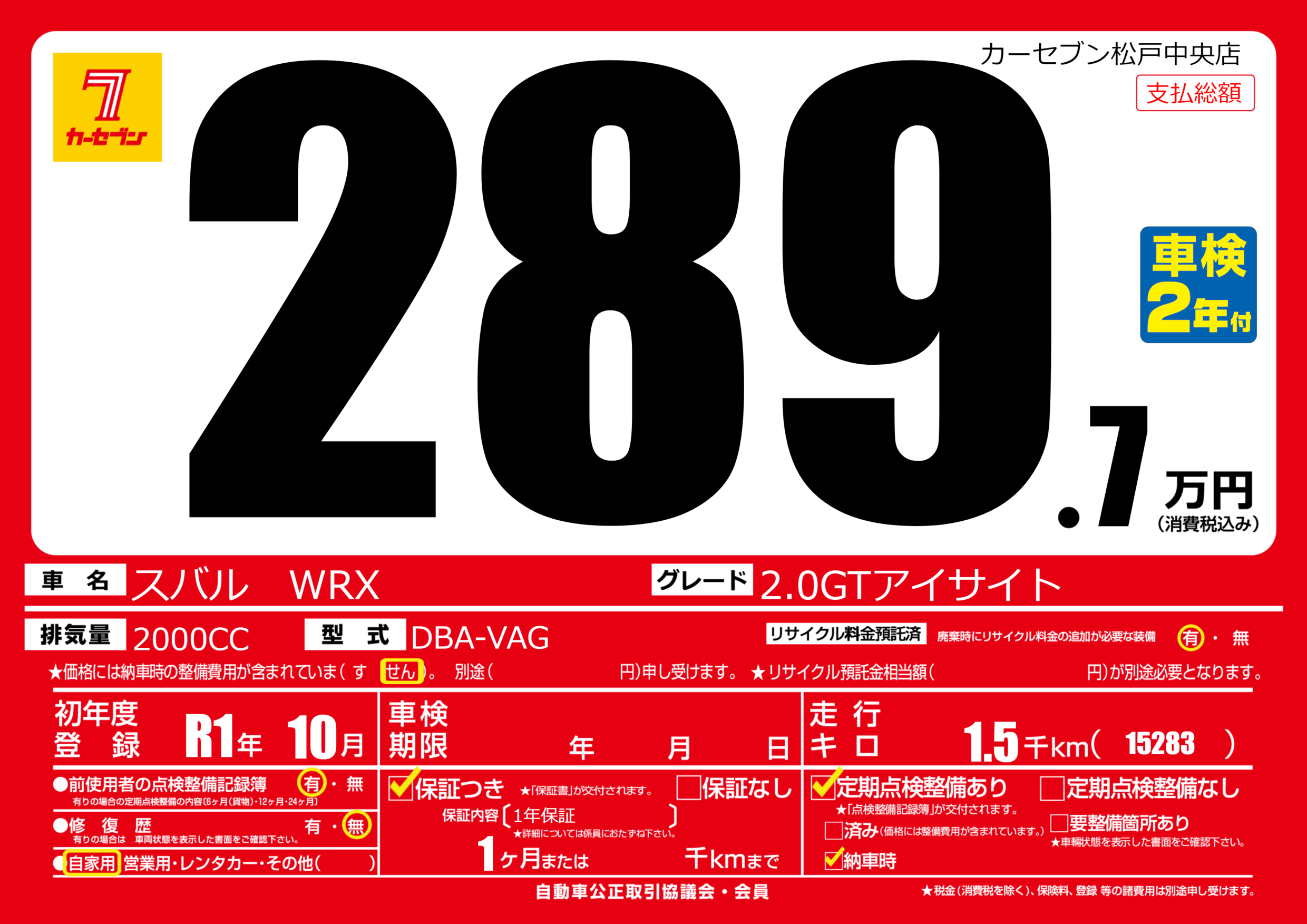| 車名 | スバル WRX | グレード ミッション 排気量 |