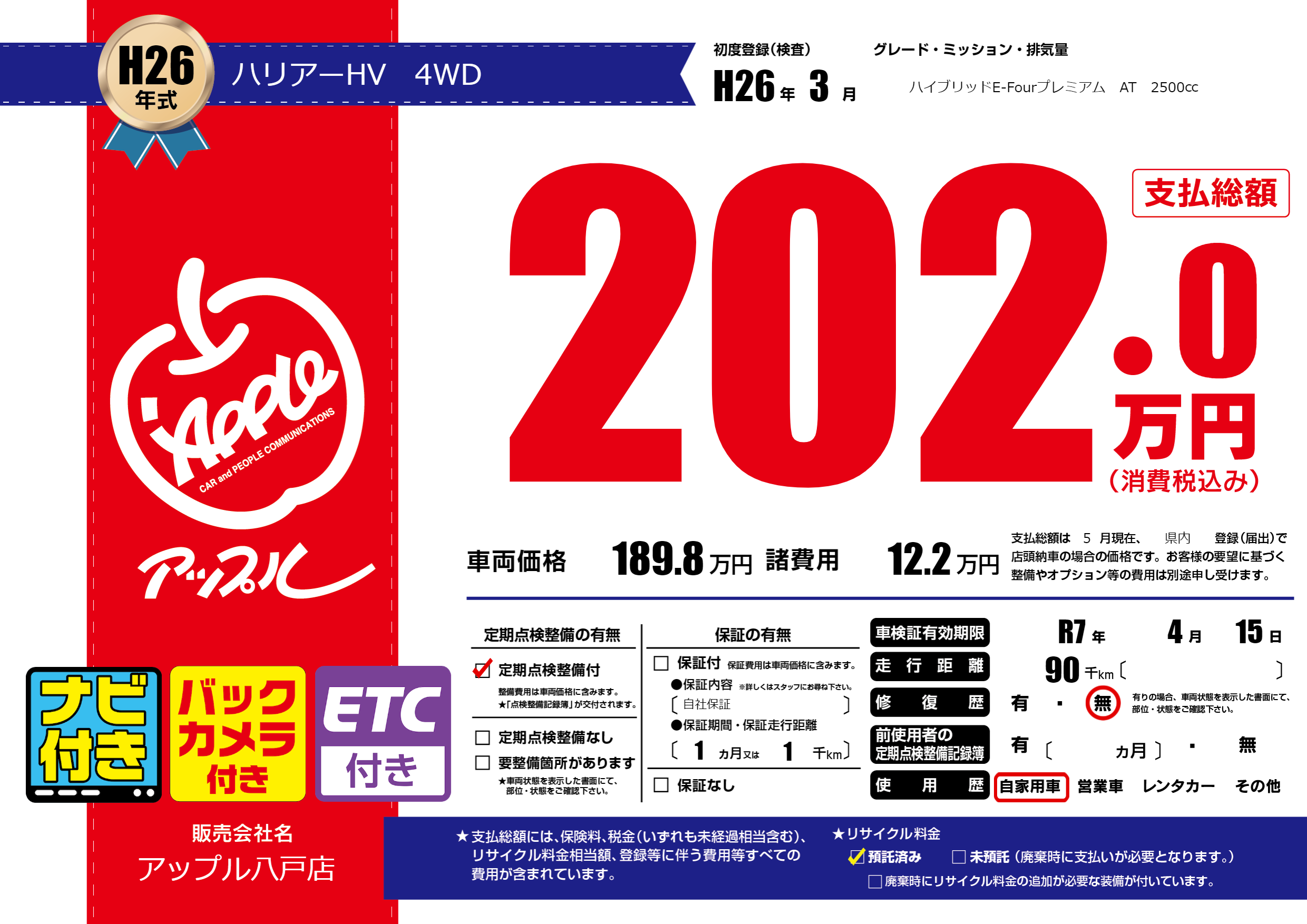 | 車検制限 | R7年 4月 15日 | ||